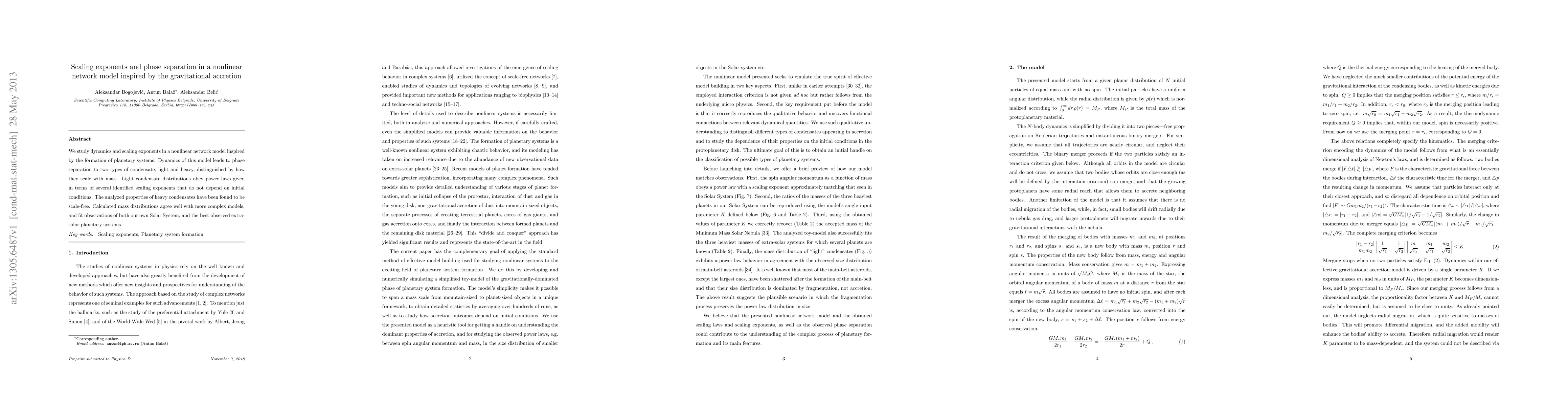 We study dynamics and scaling exponents in a nonlinear network model inspired by the formation of planetary systems. Dynamics of this model leads to phase separation to two types of condensate, light and heavy, distinguished by how they scale with mass. Light condensate distributions obey power laws given in terms of several identified scaling exponents that do not depend on initial conditions. The analyzed properties of heavy condensates have been found to be scale-free. Calculated mass distributions agree well with more complex models, and fit observations of both our own Solar System, and the best observed extra-solar planetary systems.