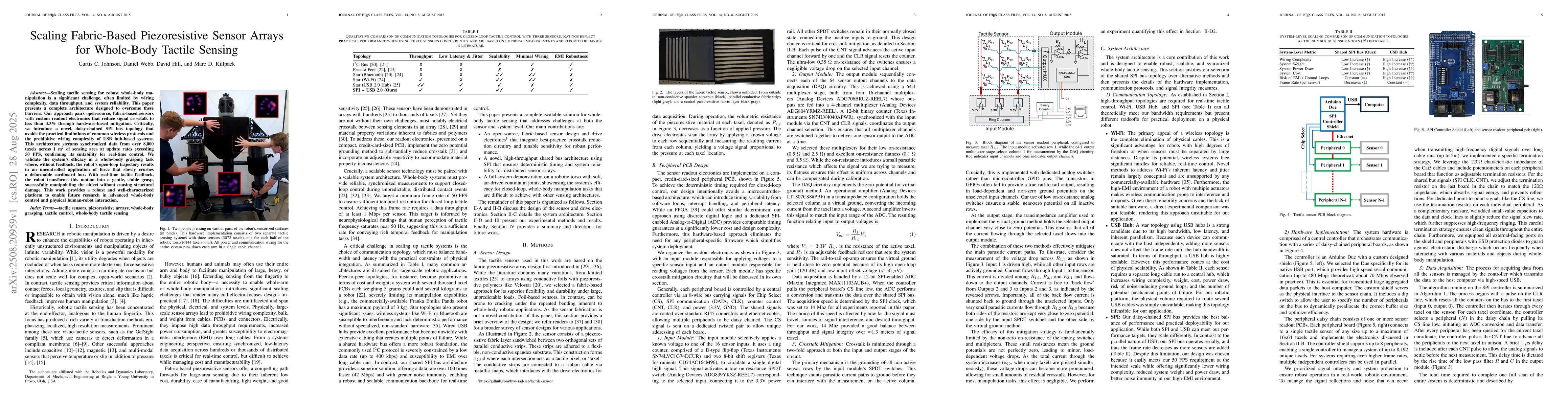 Scaling tactile sensing for robust whole-body manipulation is a significant challenge, often limited by wiring complexity, data throughput, and system reliability. This paper presents a complete architecture designed to overcome these barriers. Our approach pairs open-source, fabric-based sensors with custom readout electronics that reduce signal crosstalk to less than 3.3% through hardware-based mitigation. Critically, we introduce a novel, daisy-chained SPI bus topology that avoids the practical limitations of common wireless protocols and the prohibitive wiring complexity of USB hub-based systems. This architecture streams synchronized data from over 8,000 taxels across 1 square meter of sensing area at update rates exceeding 50 FPS, confirming its suitability for real-time control. We validate the system's efficacy in a whole-body grasping task where, without feedback, the robot's open-loop trajectory results in an uncontrolled application of force that slowly crushes a deformable cardboard box. With real-time tactile feedback, the robot transforms this motion into a gentle, stable grasp, successfully manipulating the object without causing structural damage. This work provides a robust and well-characterized platform to enable future research in advanced whole-body control and physical human-robot interaction.