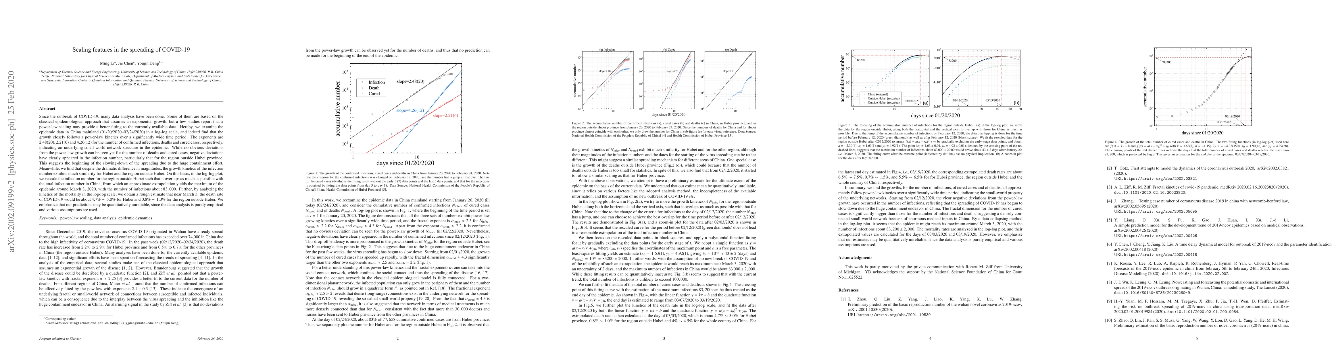Since the outbreak of COVID-19, many data analyses have been done. Some of them are based on the classical epidemiological approach that assumes an exponential growth, but a few studies report that a power-law scaling may provide a better fit to the currently available data. Hereby, we examine the data in China (01/20/2020--02/24/2020), and indeed find that the growth closely follows a power-law kinetics over a significantly wide time period. The exponents are $2.48(20)$, $2.21(6)$ and $4.26(12)$ for the number of confirmed infections, deaths and cured cases, respectively, indicating an underlying small-world network structure in the pandemic. While no obvious deviations from the power-law growth can be seen yet for the number of deaths and cured cases, negative deviations have clearly appeared in the number of infections, particularly that for the region outside Hubei. This suggests the beginning of the slowing-down of the virus spreading due to the huge containment effort. Meanwhile, we find that despite the dramatic difference in magnitudes, the growth kinetics of the infection number exhibits much similarity for Hubei province and the region outside Hubei. On this basis, in log-log plot, we rescale the infection number for the region outside Hubei such that it overlaps as much as possible with the total infection number in China, from which an approximate extrapolation yields the maximum of the pandemic around March 3, 2020, with the number of infections about $83,000$. Further, by analyzing the kinetics of the mortality in log-log scale, we obtains a rough estimate that near March 3, the death rate of COVID-19 would be about $4.7\%\thicksim 5.0\%$ for Hubei province and $0.7\%\thicksim1.0\%$ for the region outside Hubei. We emphasize that our predictions may be quantitatively unreliable, since the data analysis is purely empirical and various assumptions are used.