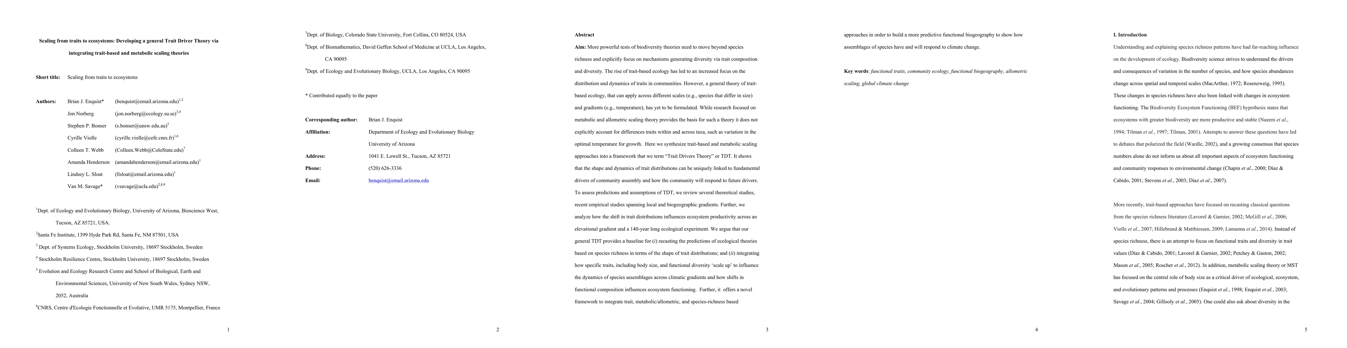 This paper develops the Trait Driver Theory (TDT) by integrating trait-based ecology and metabolic scaling theories to create a general framework that links trait distributions to ecological community assembly and ecosystem responses to environmental changes. TDT aims to recast ecological predictions based on species richness in terms of trait distribution shapes and to predict how shifts in functional composition influence ecosystem functioning across climatic gradients.