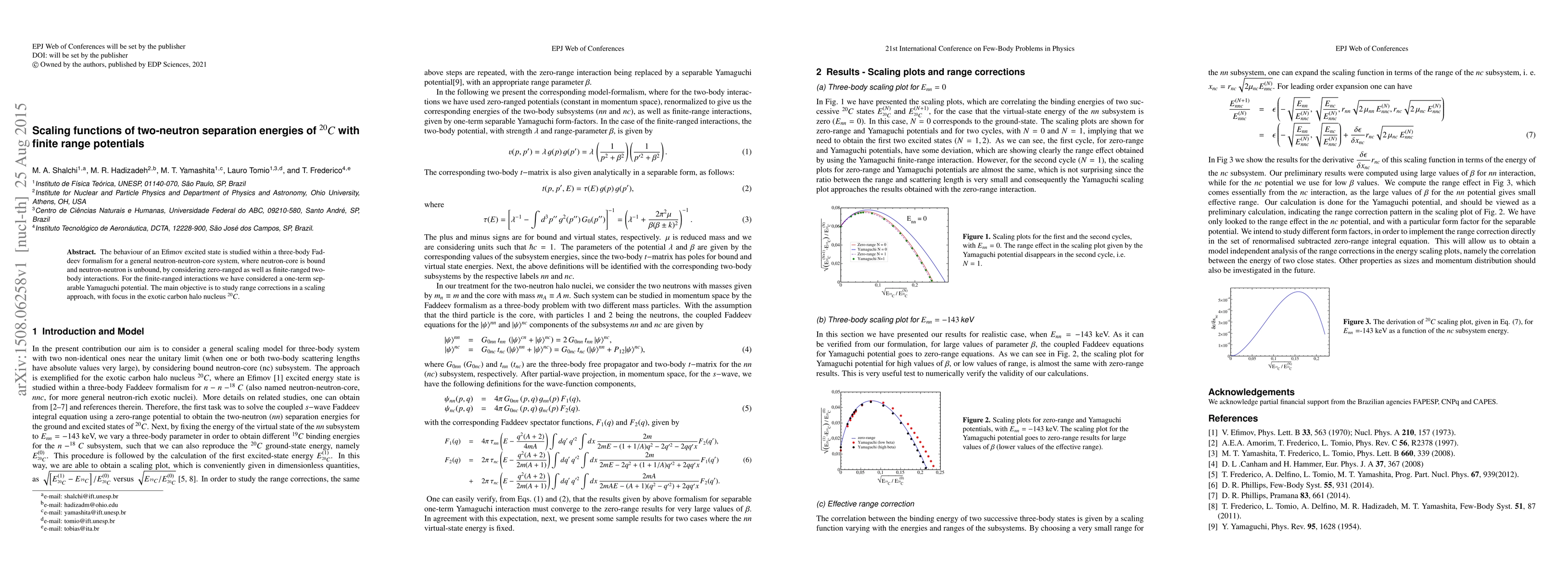 The behaviour of an Efimov excited state is studied within a three-body Faddeev formalism for a general neutron-neutron-core system, where neutron-core is bound and neutron-neutron is unbound, by considering zero-ranged as well as finite-ranged two-body interactions. For the finite-ranged interactions we have considered a one-term separable Yamaguchi potential. The main objective is to study range corrections in a scaling approach, with focus in the exotic carbon halo nucleus $^{20}C$.