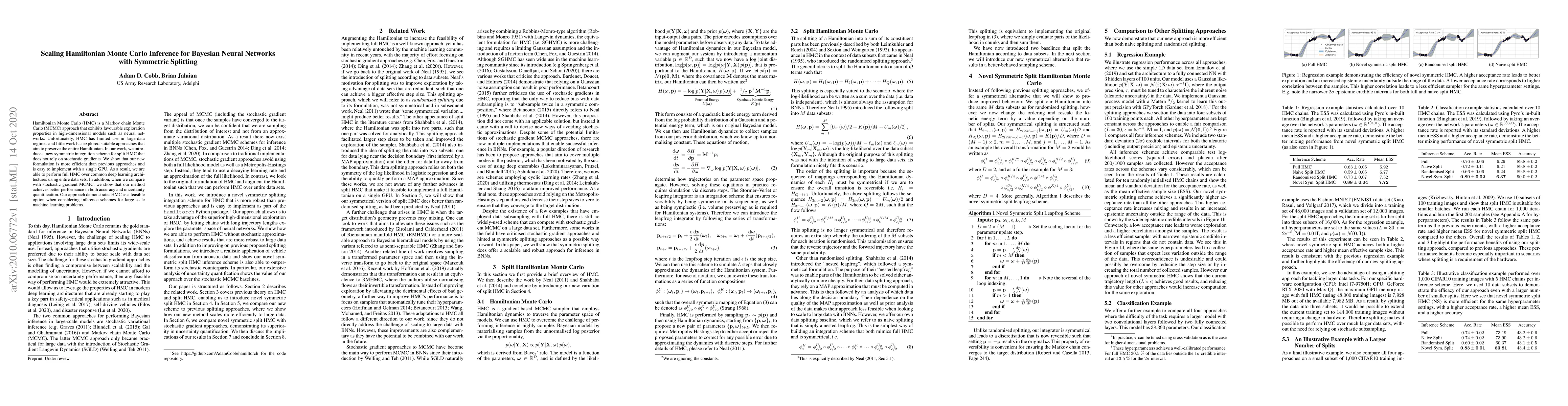 This paper introduces a new symmetric integration scheme for split Hamiltonian Monte Carlo (HMC) that enhances efficiency for Bayesian neural networks without using stochastic gradients. The proposed method outperforms previous approaches and enables full HMC over large datasets, achieving better accuracy and uncertainty quantification compared to stochastic gradient MCMC.