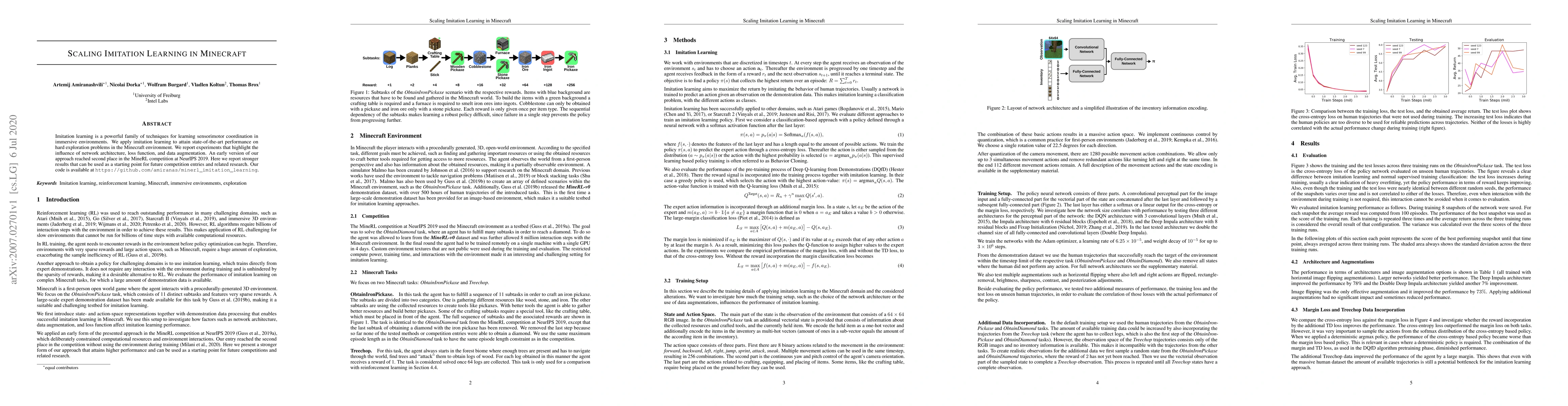Imitation learning is a powerful family of techniques for learning sensorimotor coordination in immersive environments. We apply imitation learning to attain state-of-the-art performance on hard exploration problems in the Minecraft environment. We report experiments that highlight the influence of network architecture, loss function, and data augmentation. An early version of our approach reached second place in the MineRL competition at NeurIPS 2019. Here we report stronger results that can be used as a starting point for future competition entries and related research. Our code is available at https://github.com/amiranas/minerl_imitation_learning.