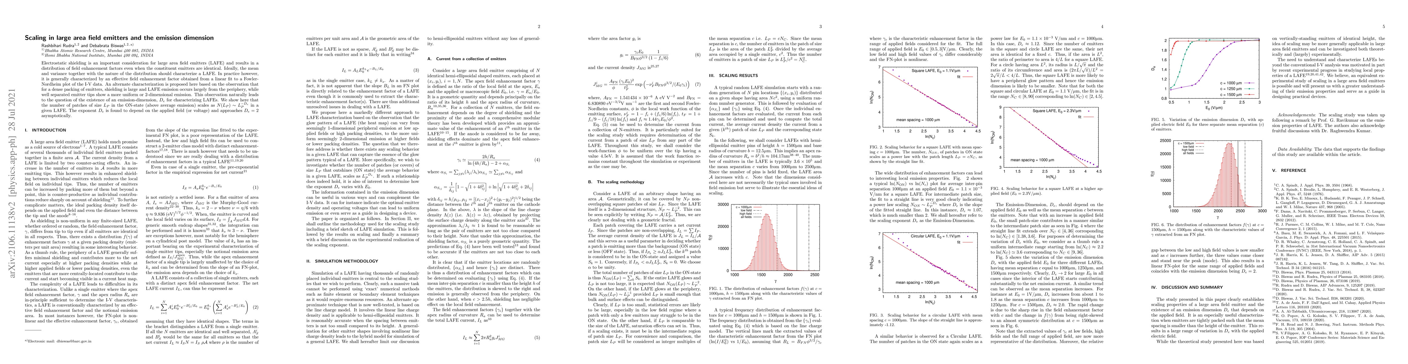 This paper proposes a new characterization for large area field emitters (LAFE) based on emission dimension, $D_e$, which scales with the number of ON-state patches. The study finds that $D_e$ depends on the applied field and approaches 2 in the high-field limit, indicating a transition from 2D to 1D emission behavior.