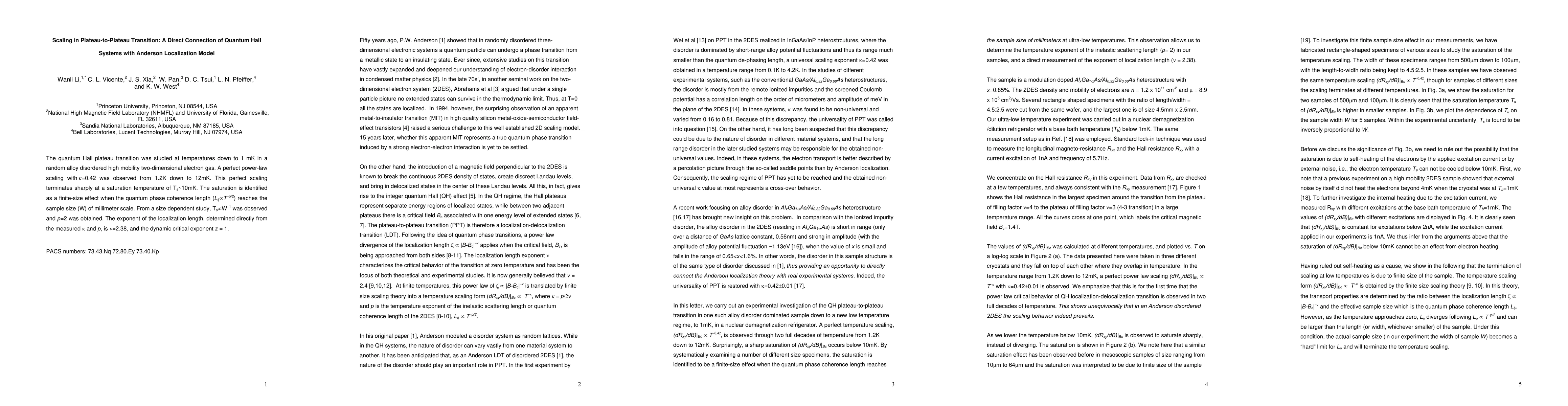 The quantum Hall plateau transition was studied at temperatures down to 1 mK in a random alloy disordered high mobility two-dimensional electron gas. A perfect power-law scaling with \kappa=0.42 was observed from 1.2K down to 12mK. This perfect scaling terminates sharply at a saturation temperature of T_s~10mK. The saturation is identified as a finite-size effect when the quantum phase coherence length (L_{\phi} ~ T^{-p/2}) reaches the sample size (W) of millimeter scale. From a size dependent study, T_s \propto W^{-1} was observed and p=2 was obtained. The exponent of the localization length, determined directly from the measured \kappa and p, is \nu=2.38, and the dynamic critical exponent z = 1.