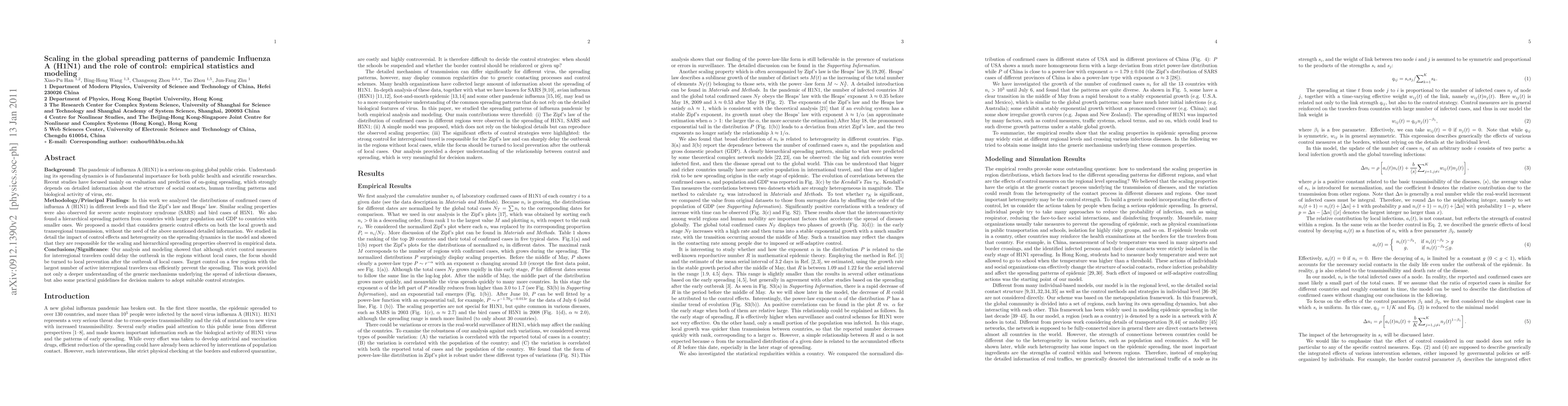 Background: The pandemic of influenza A (H1N1) is a serious on-going global public crisis. Understanding its spreading dynamics is of fundamental importance for both public health and scientific researches. Recent studies have focused mainly on evaluation and prediction of on-going spreading, which strongly depends on detailed information about the structure of social contacts, human traveling patterns and biological activity of virus, etc. Methodology/Principal Findings: In this work we analyzed the distributions of confirmed cases of influenza A (H1N1) in different levels and find the Zipf's law and Heaps' law. Similar scaling properties were also observed for severe acute respiratory syndrome (SARS) and bird cases of H5N1. We also found a hierarchical spreading pattern from countries with larger population and GDP to countries with smaller ones. We proposed a model that considers generic control effects on both the local growth and transregional transmission, without the need of the above mentioned detailed information. We studied in detail the impact of control effects and heterogeneity on the spreading dynamics in the model and showed that they are responsible for the scaling and hierarchical spreading properties observed in empirical data. Conclusions/Significance: Our analysis and modeling showed that although strict control measures for interregional travelers could delay the outbreak in the regions without local cases, the focus should be turned to local prevention after the outbreak of local cases. Target control on a few regions with the largest number of active interregional travelers can efficiently prevent the spreading. This work provided not only a deeper understanding of the generic mechanisms underlying the spread of infectious diseases, but also some practical guidelines for decision makers to adopt suitable control strategies.