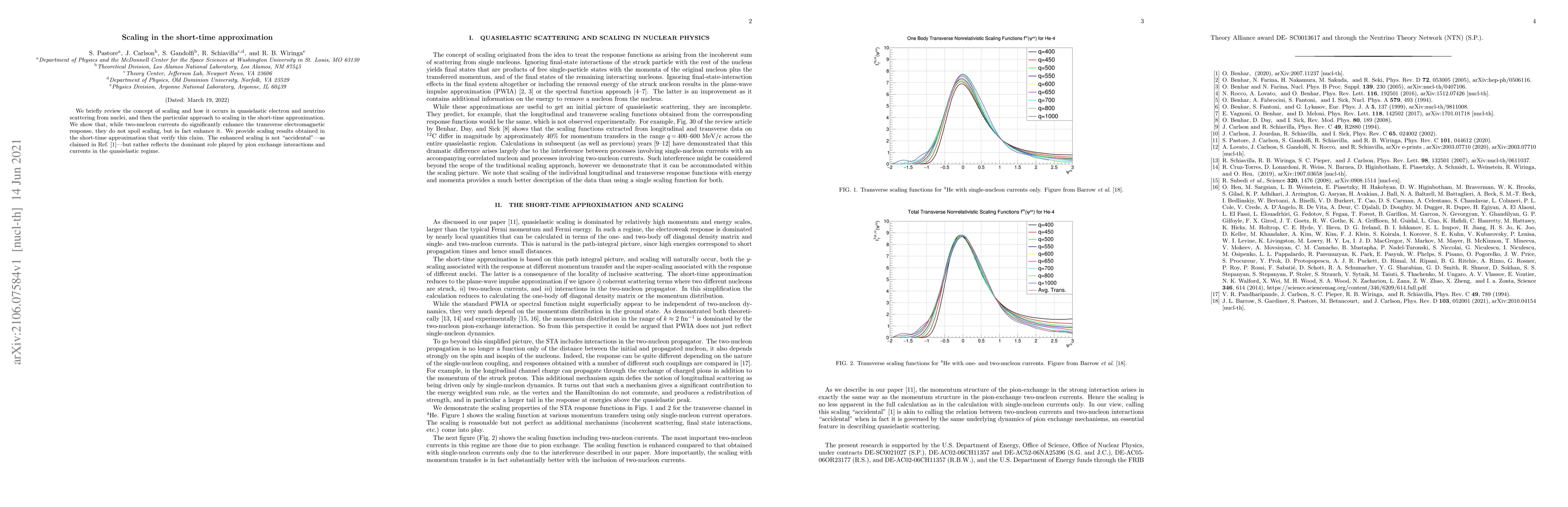 We briefly review the concept of scaling and how it occurs in quasielastic electron and neutrino scattering from nuclei, and then the particular approach to scaling in the short-time approximation. We show that, while two-nucleon currents do significantly enhance the transverse electromagnetic response, they do not spoil scaling, but in fact enhance it. We provide scaling results obtained in the short-time approximation that verify this claim. The enhanced scaling is not ``accidental'' -- as claimed in Ref.~\cite{Benhar:2020jye} -- but rather reflects the dominant role played by pion exchange interactions and currents in the quasielastic regime.