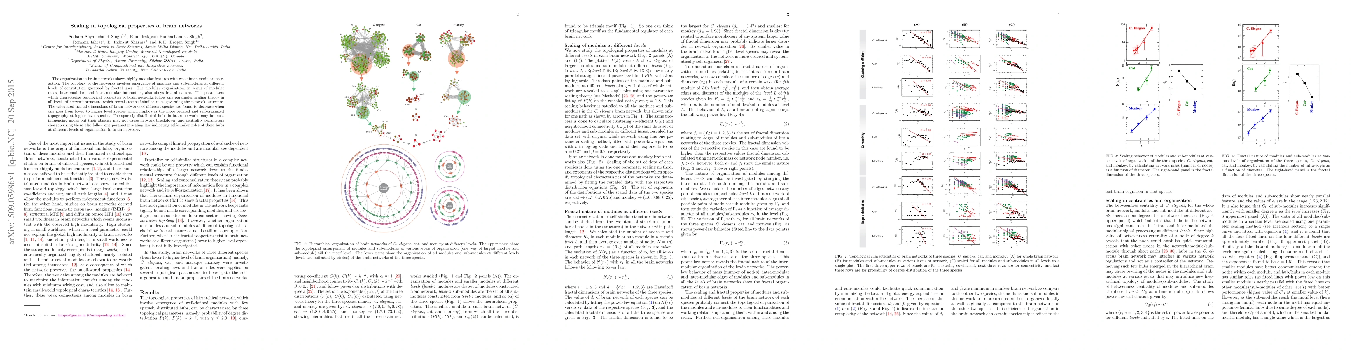 The organization in brain networks shows highly modular features with weak inter-modular interaction. The topology of the networks involves emergence of modules and sub-modules at different levels of constitution governed by fractal laws. The modular organization, in terms of modular mass, inter-modular, and intra-modular interaction, also obeys fractal nature. The parameters which characterize topological properties of brain networks follow one parameter scaling theory in all levels of network structure which reveals the self-similar rules governing the network structure. The calculated fractal dimensions of brain networks of different species are found to decrease when one goes from lower to higher level species which implicates the more ordered and self-organized topography at higher level species. The sparsely distributed hubs in brain networks may be most influencing nodes but their absence may not cause network breakdown, and centrality parameters characterizing them also follow one parameter scaling law indicating self-similar roles of these hubs at different levels of organization in brain networks.