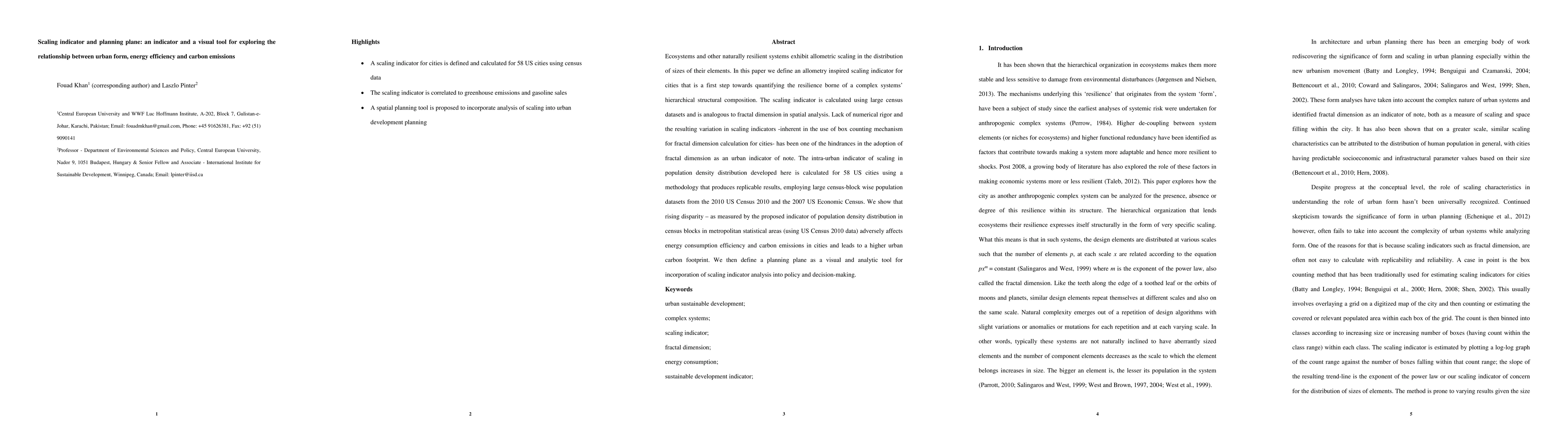 Ecosystems and other naturally resilient systems exhibit allometric scaling in the distribution of sizes of their elements. In this paper we define an allometry inspired scaling indicator for cities that is a first step towards quantifying the resilience borne of a complex systems' hierarchical structural composition. The scaling indicator is calculated using large census datasets and is analogous to fractal dimension in spatial analysis. Lack of numerical rigor and the resulting variation in scaling indicators -inherent in the use of box counting mechanism for fractal dimension calculation for cities- has been one of the hindrances in the adoption of fractal dimension as an urban indicator of note. The intra-urban indicator of scaling in population density distribution developed here is calculated for 58 US cities using a methodology that produces replicable results, employing large census-block wise population datasets from the 2010 US Census 2010 and the 2007 US Economic Census. We show that rising disparity -as measured by the proposed indicator of population density distribution in census blocks in metropolitan statistical areas (using US Census 2010 data) adversely affects energy consumption efficiency and carbon emissions in cities and leads to a higher urban carbon footprint. We then define a planning plane as a visual and analytic tool for incorporation of scaling indicator analysis into policy and decision-making.