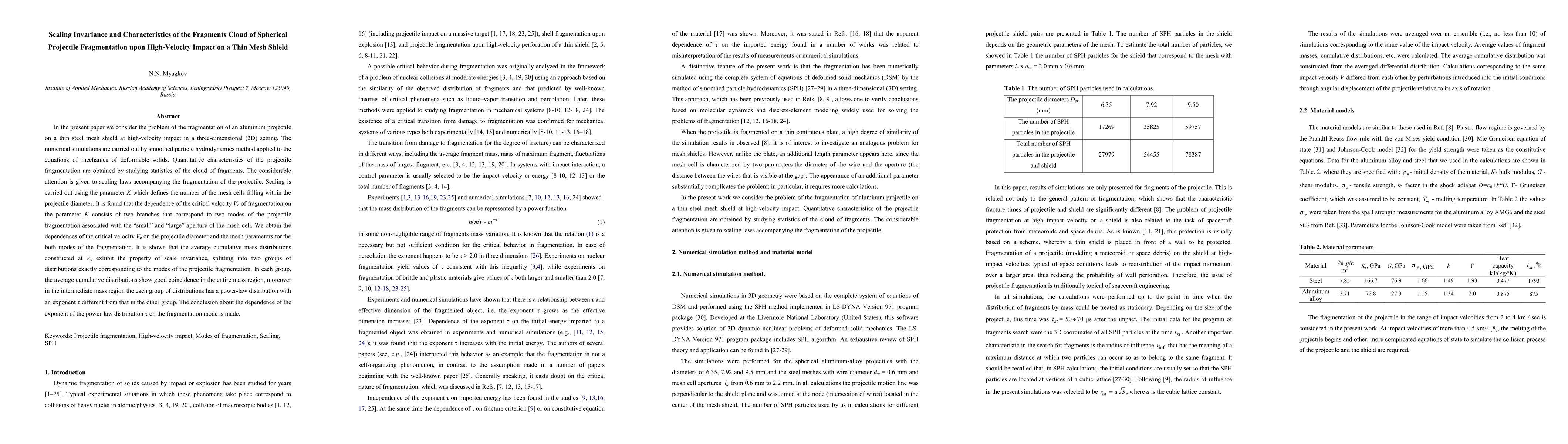 In the present paper we consider the problem of the fragmentation of an aluminum projectile on a thin steel mesh shield at high-velocity impact in a three-dimensional (3D) setting. The numerical simulations are carried out by smoothed particle hydrodynamics method applied to the equations of mechanics of deformable solids. Quantitative characteristics of the projectile fragmentation are obtained by studying statistics of the cloud of fragments. The considerable attention is given to scaling laws accompanying the fragmentation of the projectile. Scaling is carried out using the parameter K which defines the number of the mesh cells falling within the projectile diameter. It is found that the dependence of the critical velocity Vc of fragmentation on the parameter K consists of two branches that correspond to two modes of the projectile fragmentation associated with the "small" and "large" aperture of the mesh cell. We obtain the dependences of the critical velocity Vc on the projectile diameter and the mesh parameters for the both modes of the fragmentation. It is shown that the average cumulative mass distributions constructed at Vc exhibit the property of scale invariance, splitting into two groups of distributions exactly corresponding to the modes of the projectile fragmentation. In each group, the average cumulative distributions show good coincidence in the entire mass region, moreover in the intermediate mass region the each group of distributions has a power-law distribution with an exponent tau different from that in the other group. The conclusion about the dependence of the exponent of the power-law distribution tau on the fragmentation mode is made.