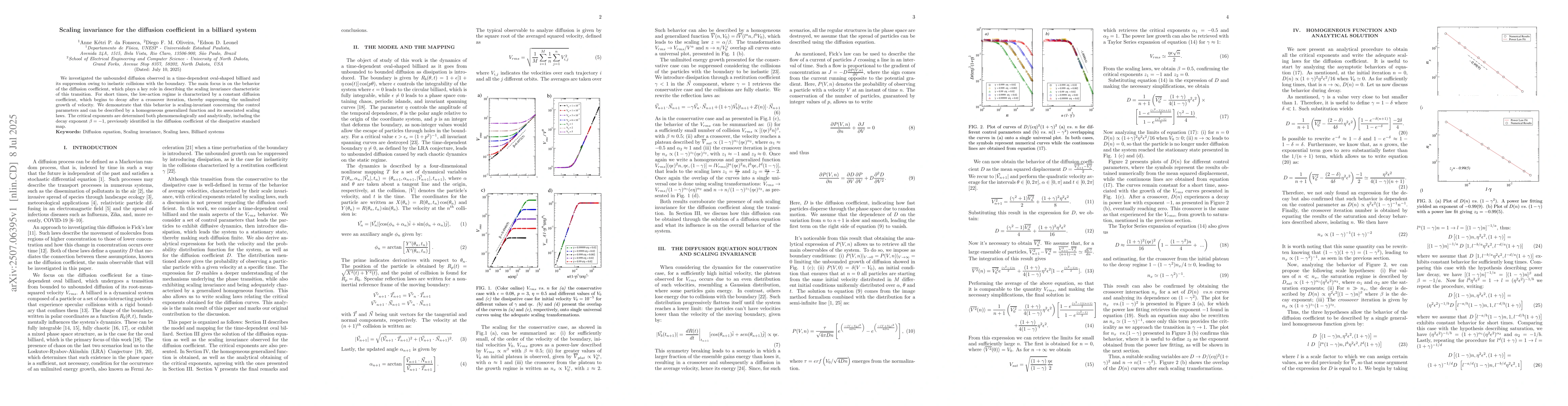 We investigated the unbounded diffusion observed in a time-dependent oval-shaped billiard and its suppression owing to inelastic collisions with the boundary. The main focus is on the behavior of the diffusion coefficient, which plays a key role in describing the scaling invariance characteristic of this transition. For short times, the low-action regime is characterized by a constant diffusion coefficient, which begins to decay after a crossover iteration, thereby suppressing the unlimited growth of velocity. We demonstrate that this behavior is scaling-invariant concerning the control parameters and can be described by a homogeneous generalized function and its associated scaling laws. The critical exponents are determined both phenomenologically and analytically, including the decay exponent beta = -1, previously identified in the diffusion coefficient of the dissipative standard map.