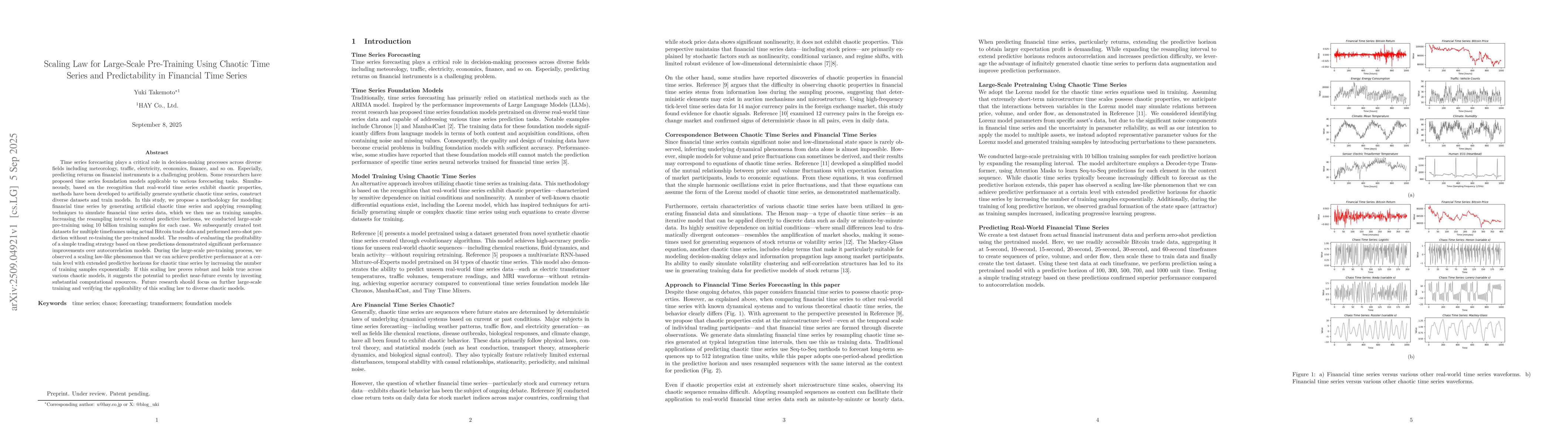 Time series forecasting plays a critical role in decision-making processes across diverse fields including meteorology, traffic, electricity, economics, finance, and so on. Especially, predicting returns on financial instruments is a challenging problem. Some researchers have proposed time series foundation models applicable to various forecasting tasks. Simultaneously, based on the recognition that real-world time series exhibit chaotic properties, methods have been developed to artificially generate synthetic chaotic time series, construct diverse datasets and train models. In this study, we propose a methodology for modeling financial time series by generating artificial chaotic time series and applying resampling techniques to simulate financial time series data, which we then use as training samples. Increasing the resampling interval to extend predictive horizons, we conducted large-scale pre-training using 10 billion training samples for each case. We subsequently created test datasets for multiple timeframes using actual Bitcoin trade data and performed zero-shot prediction without re-training the pre-trained model. The results of evaluating the profitability of a simple trading strategy based on these predictions demonstrated significant performance improvements over autocorrelation models. During the large-scale pre-training process, we observed a scaling law-like phenomenon that we can achieve predictive performance at a certain level with extended predictive horizons for chaotic time series by increasing the number of training samples exponentially. If this scaling law proves robust and holds true across various chaotic models, it suggests the potential to predict near-future events by investing substantial computational resources. Future research should focus on further large-scale training and verifying the applicability of this scaling law to diverse chaotic models.