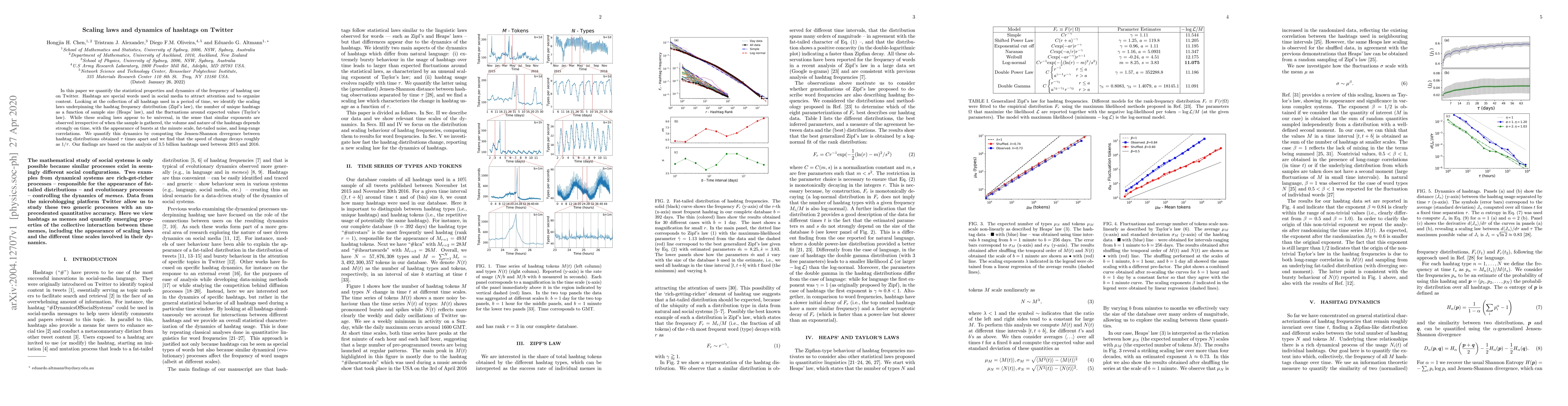 This paper analyzes the statistical properties and dynamics of hashtag usage on Twitter, identifying scaling laws such as Zipf's, Heaps', and Taylor's laws. It finds that while these laws are universal, hashtag usage exhibits time-dependent dynamics, including bursts and long-range correlations, with the speed of change decaying inversely with time intervals.