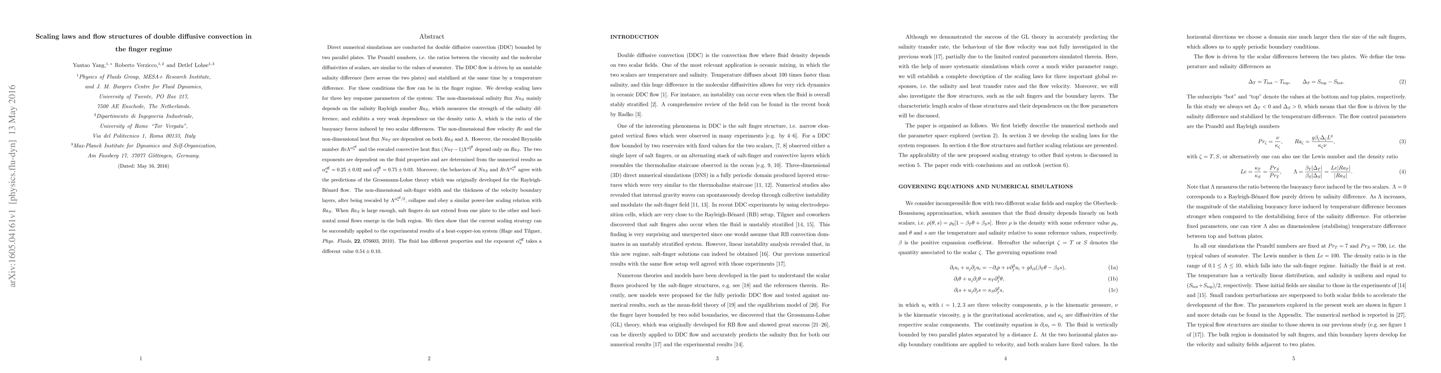 This paper presents direct numerical simulations of double diffusive convection in the finger regime, developing scaling laws for key response parameters. The study finds that the salinity flux depends mainly on the salinity Rayleigh number and weakly on the density ratio, while flow velocity and heat flux depend on both factors. The research validates Grossmann-Lohse theory predictions and successfully applies the scaling strategy to experimental results.