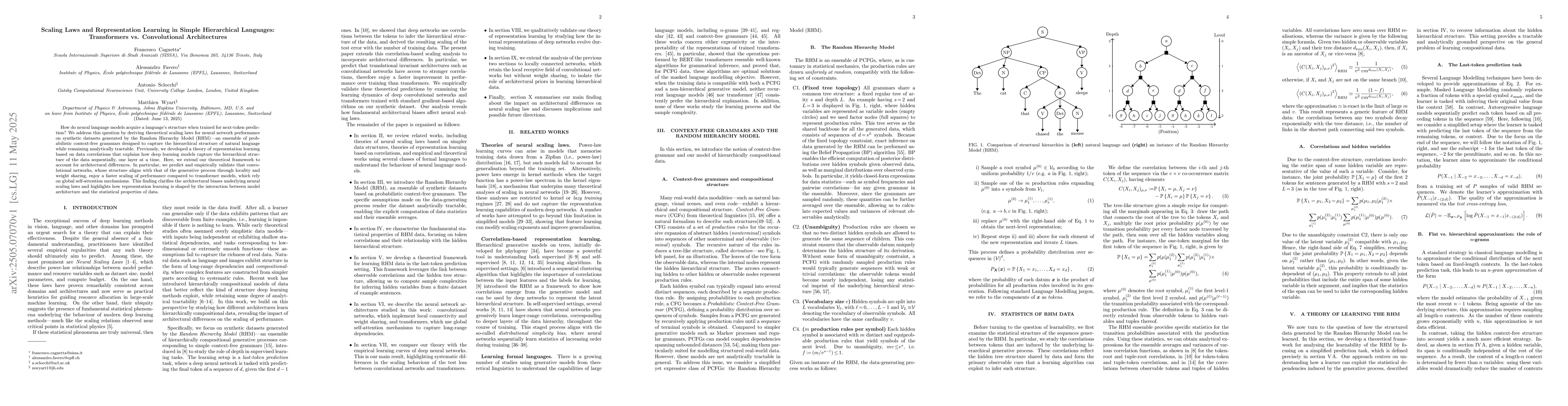 The research derives theoretical scaling laws for neural network performance using synthetic datasets generated by the Random Hierarchy Model (RHM), an ensemble of probabilistic context-free grammars. It extends a previous theory of representation learning to account for architectural differences between convolutional networks and transformer models.