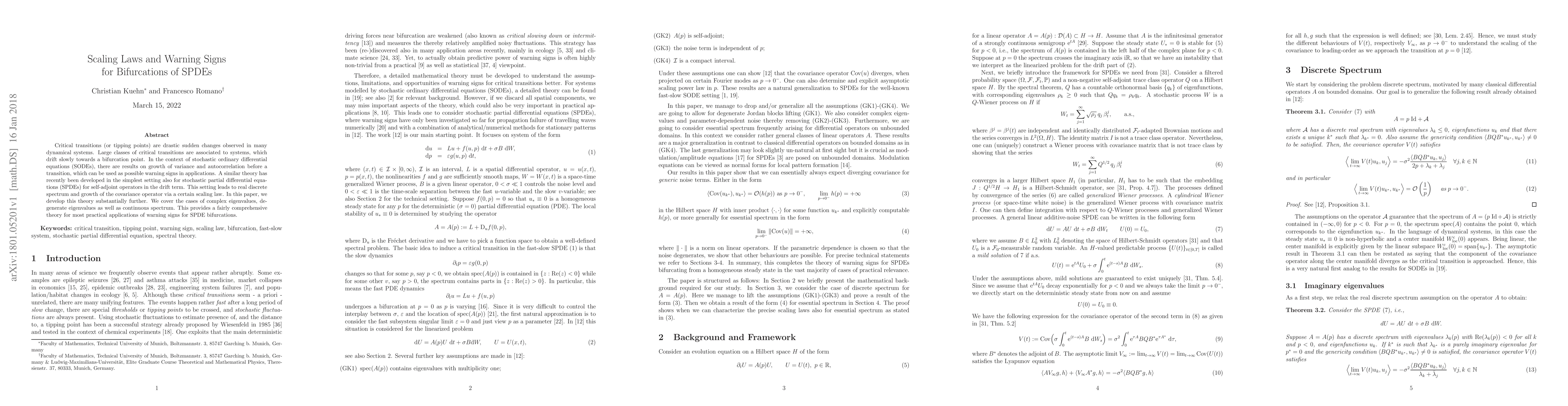 This paper extends the theory for identifying warning signs preceding bifurcations in stochastic partial differential equations (SPDEs), focusing on the growth of variance, autocorrelation, and covariance operator scaling laws. It addresses complex, degenerate eigenvalues, and continuous spectrum, offering a robust framework for detecting bifurcations in practical applications.