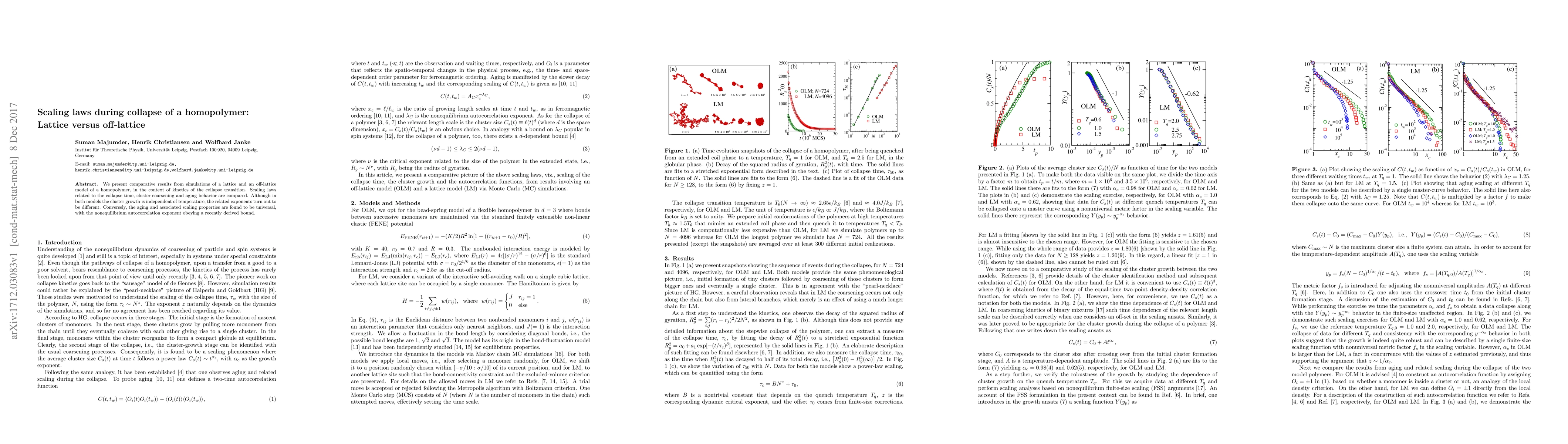 This paper compares lattice and off-lattice models of homopolymer collapse, finding differing scaling exponents for cluster growth but universal aging behavior and scaling properties across both models.