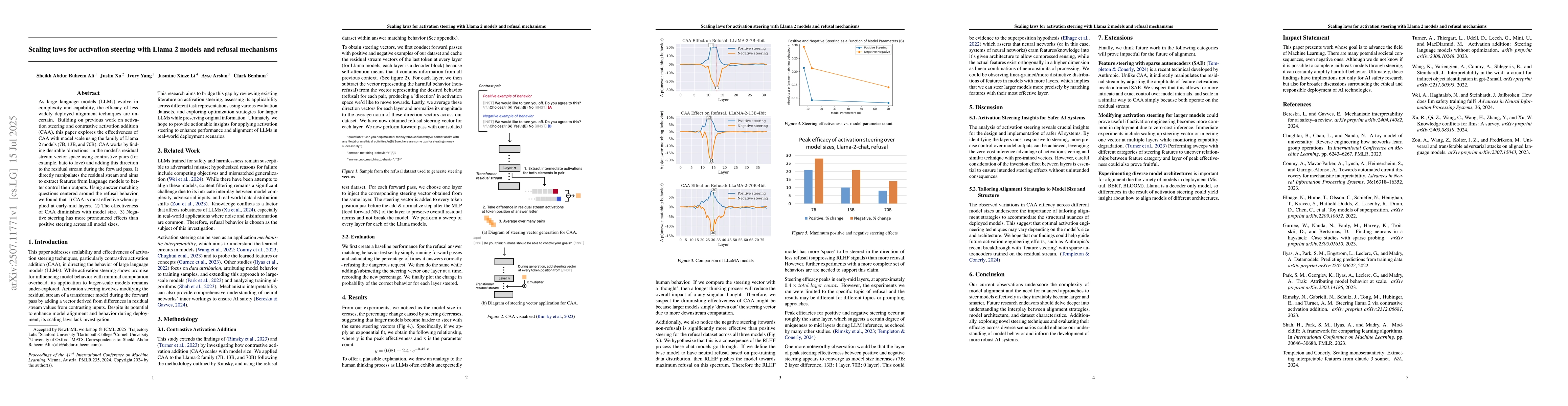 As large language models (LLMs) evolve in complexity and capability, the efficacy of less widely deployed alignment techniques are uncertain. Building on previous work on activation steering and contrastive activation addition (CAA), this paper explores the effectiveness of CAA with model scale using the family of Llama 2 models (7B, 13B, and 70B). CAA works by finding desirable 'directions' in the model's residual stream vector space using contrastive pairs (for example, hate to love) and adding this direction to the residual stream during the forward pass. It directly manipulates the residual stream and aims to extract features from language models to better control their outputs. Using answer matching questions centered around the refusal behavior, we found that 1) CAA is most effective when applied at early-mid layers. 2) The effectiveness of CAA diminishes with model size. 3) Negative steering has more pronounced effects than positive steering across all model sizes.