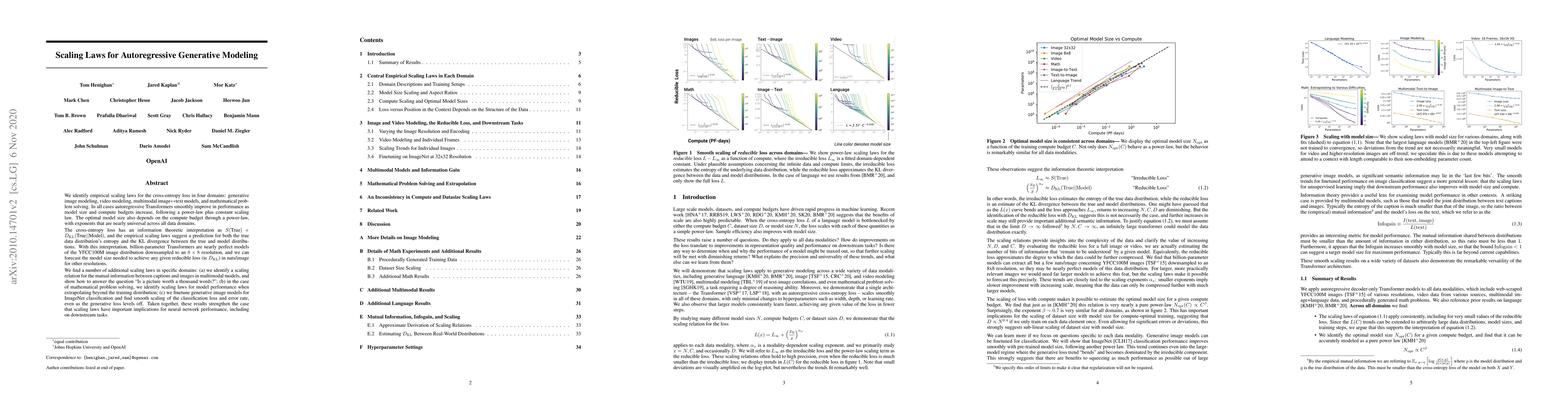 This paper identifies empirical scaling laws for autoregressive Transformers across various domains, revealing a consistent power-law relationship between model size, compute budget, and performance. The findings suggest that billion-parameter models nearly perfectly model certain image distributions and provide insights into the true data distribution's entropy and KL divergence.