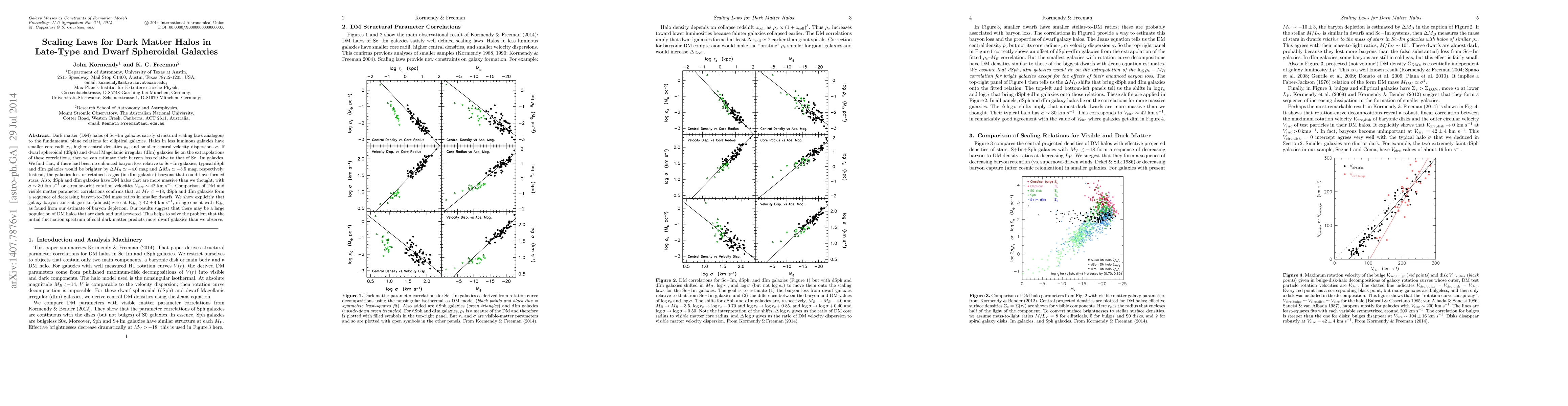 This paper explores scaling laws for dark matter halos in late-type and dwarf galaxies, finding that less luminous galaxies exhibit smaller core radii, higher central densities, and lower velocity dispersions. It estimates that typical dwarf spheroidal and dwarf irregular galaxies would be significantly brighter if they had not experienced enhanced baryon loss, suggesting a large population of undiscovered dark matter halos.