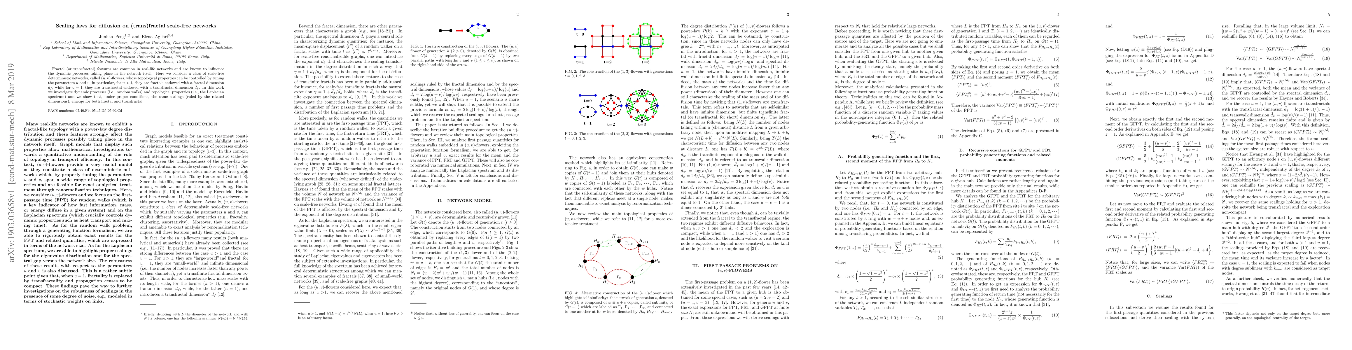This paper explores diffusion processes on $(u,v)$-flower networks, which exhibit fractal or transfractal properties, and demonstrates that scaling laws for random walks and Laplacian spectra are consistent across these network types, governed by their respective fractal and transfractal dimensions.