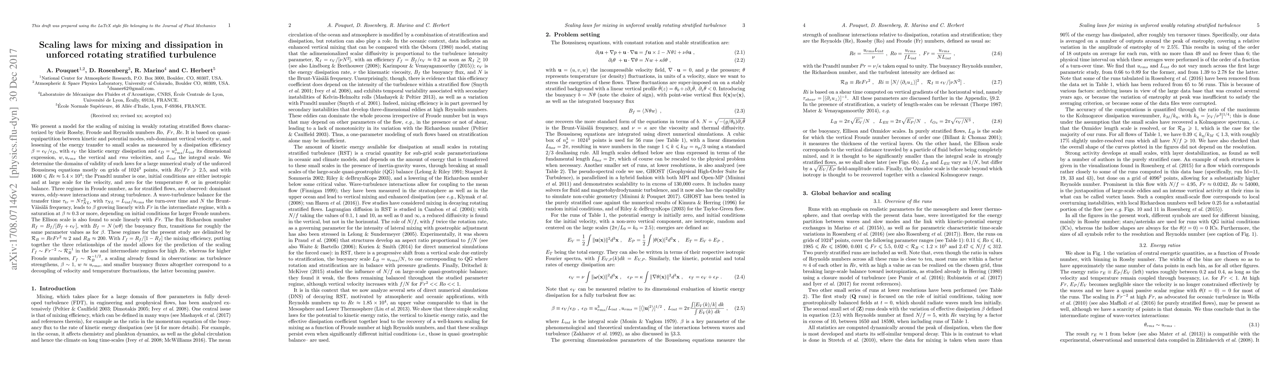 We present a model for the scaling of mixing in weakly rotating stratified flows characterized by their Rossby, Froude and Reynolds numbers Ro, Fr, Re. It is based on quasi-equipartition between kinetic and potential modes, sub-dominant vertical velocity and lessening of the energy transfer to small scales as measured by the ratio rE of kinetic energy dissipation to its dimensional expression. We determine their domains of validity for a numerical study of the unforced Boussinesq equations mostly on grids of 10243 points, with Ro/Fr> 2.5 and with 1600< Re<1.9x104; the Prandtl number is one, initial conditions are either isotropic and at large scale for the velocity, and zero for the temperature {\theta}, or in geostrophic balance. Three regimes in Fr are observed: dominant waves, eddy-wave interactions and strong turbulence. A wave-turbulence balance for the transfer time leads to rE growing linearly with Fr in the intermediate regime, with a saturation at ~0.3 or more, depending on initial conditions for larger Froude numbers. The Ellison scale is also found to scale linearly with Fr, and the flux Richardson number Rf transitions for roughly the same parameter values as well. Putting together the 3 relationships of the model allows for the prediction of mixing efficiency scaling as Fr-2~RB-1 in the low and intermediate regimes, whereas for higher Fr, it scales as RB-1/2, as already observed: as turbulence strengthens, rE~1, the velocity is isotropic and smaller buoyancy fluxes altogether correspond to a decoupling of velocity and temperature fluctuations, the latter becoming passive.