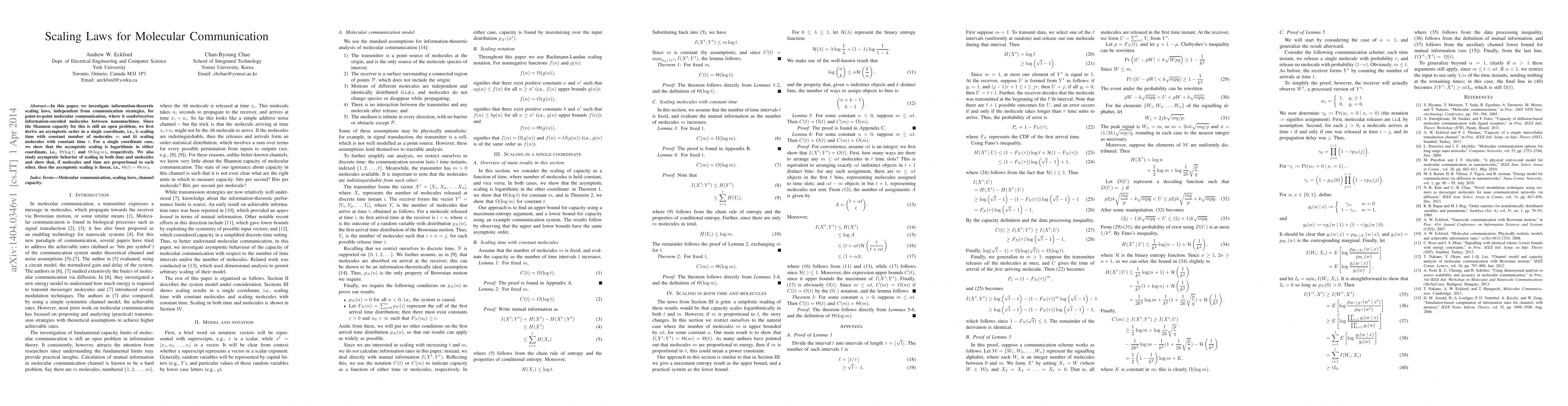 This paper explores the information-theoretic scaling laws for point-to-point molecular communication, deriving asymptotic orders for scaling time and molecules. It finds logarithmic scaling in either coordinate and linear scaling when molecules and time are proportional.