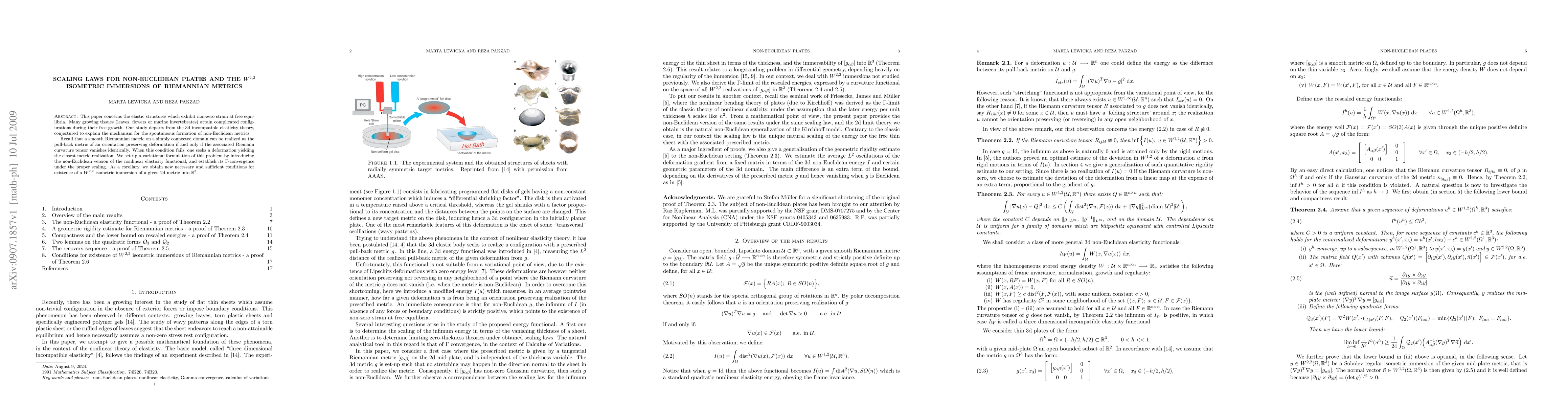 This paper concerns the elastic structures which exhibit non-zero strain at free equilibria. Many growing tissues (leaves, flowers or marine invertebrates) attain complicated configurations during their free growth. Our study departs from the 3d incompatible elasticity theory, conjectured to explain the mechanism for the spontaneous formation of non-Euclidean metrics. Recall that a smooth Riemannian metric on a simply connected domain can be realized as the pull-back metric of an orientation preserving deformation if and only if the associated Riemann curvature tensor vanishes identically. When this condition fails, one seeks a deformation yielding the closest metric realization. We set up a variational formulation of this problem by introducing the non-Euclidean version of the nonlinear elasticity functional, and establish its $\Gamma$-convergence under the proper scaling. As a corollary, we obtain new necessary and sufficient conditions for existence of a $W^{2,2}$ isometric immersion of a given 2d metric into $\mathbb R^3$.