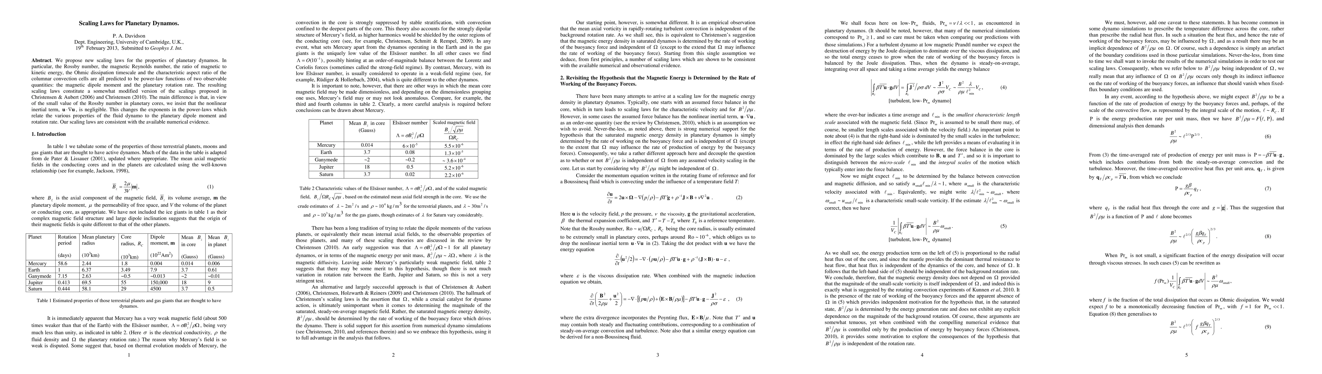 This paper introduces new scaling laws for planetary dynamos, showing that key properties like the Rossby number and magnetic energy ratios are power-law functions of the magnetic dipole moment and rotation rate. The proposed scalings differ from previous models by neglecting the nonlinear inertial term, leading to modified exponents and better consistency with numerical simulations.