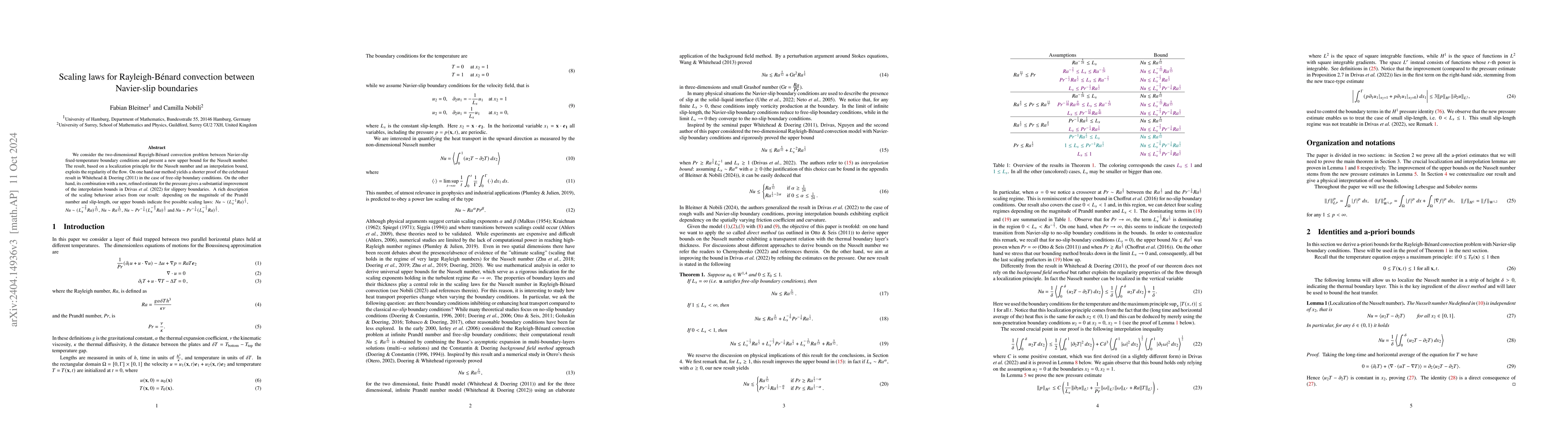 This research introduces a new upper bound for the Nusselt number in two-dimensional Rayleigh-Bénard convection with Navier-slip boundaries, providing shorter proofs for existing results and improving interpolation bounds. The study reveals five scaling laws depending on Prandtl number and slip-length, enhancing the understanding of fluid dynamics in convection systems.