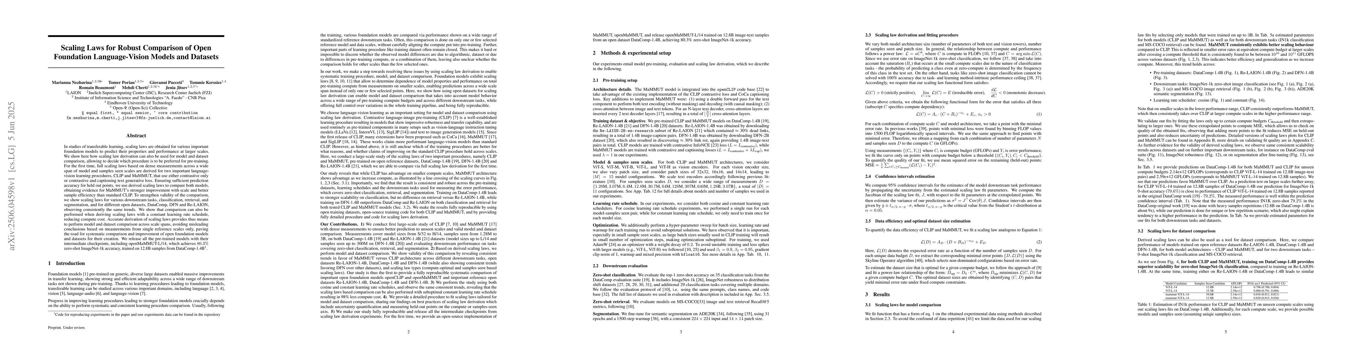 The paper derives scaling laws for two language-vision learning procedures, CLIP and MaMMUT, using dense measurements across a wide range of model and sample scales. It employs contrastive loss for CLIP and both contrastive and captioning text generative loss for MaMMUT. The study compares these models on various downstream tasks and datasets, including classification, retrieval, segmentation, DataComp, DFN, and Re-LAION, while also examining scaling laws with a constant learning rate schedule.