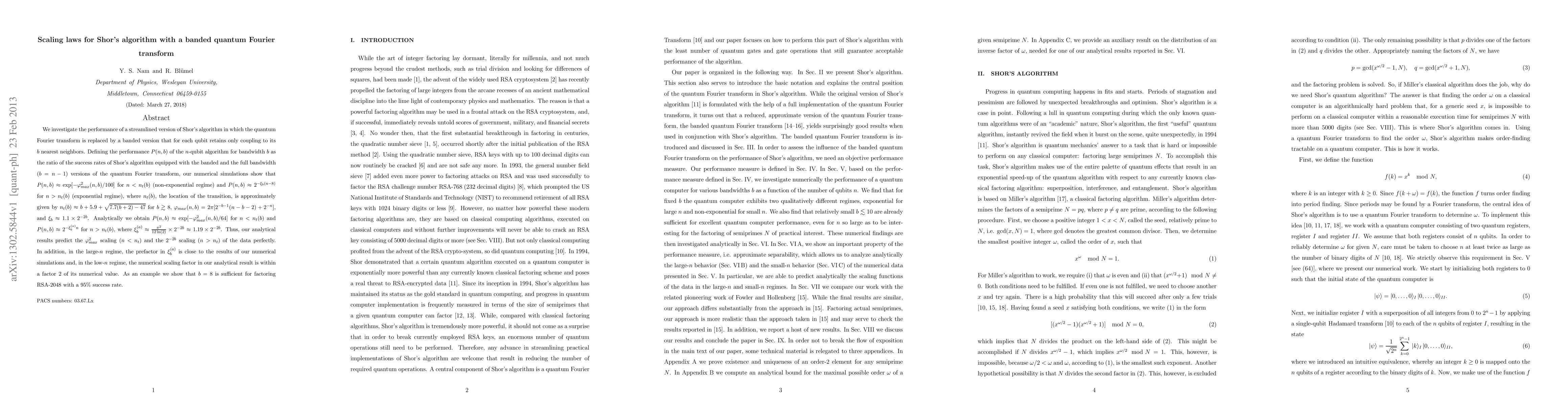 This research explores a modified Shor's algorithm using a banded quantum Fourier transform, retaining coupling to nearest neighbors. Numerical simulations and analytical results show that the algorithm's performance scales as exp[-φ_max^2(n,b)/100] for smaller n and 2^(-ξ_b*(n-8)) for larger n, with transition point n_t(b). Analytical predictions accurately match numerical scaling factors, suggesting b=8 qubits suffice for factoring RSA-2048 with 95% success.