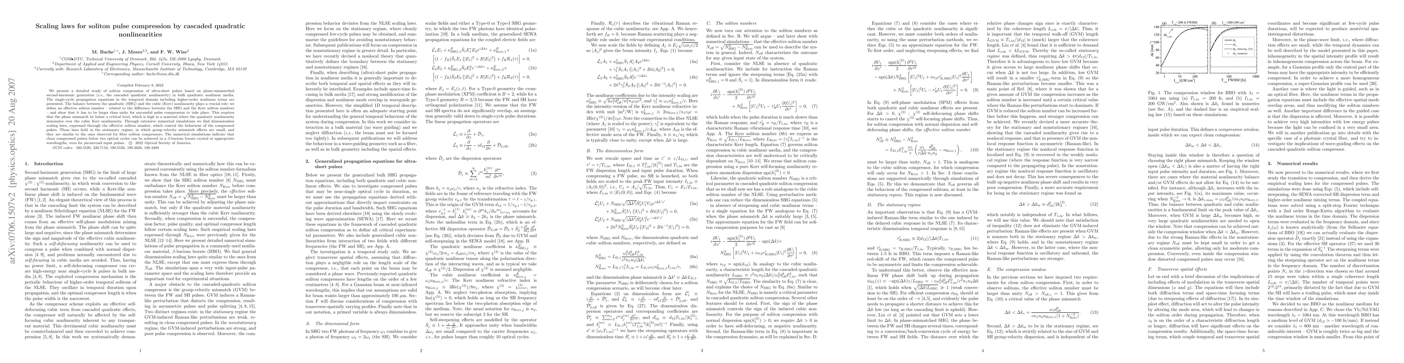 This paper investigates soliton pulse compression via phase-mismatched second-harmonic generation in bulk nonlinear media, defining an effective soliton number that must exceed one for successful compression. Numerical simulations reveal scaling laws governing the behavior of compressed pulses, similar to those in fiber soliton compressors, enabling the generation of ultra-short pulses in $\beta$-barium borate crystals.