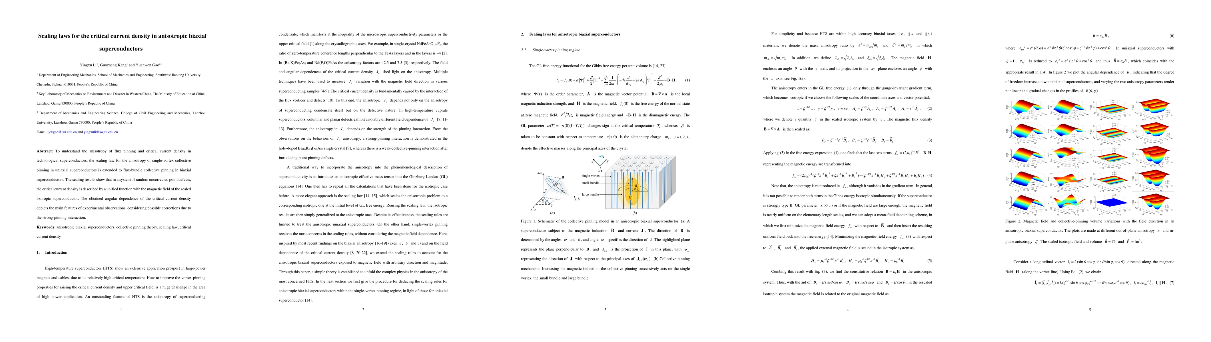 This paper extends the scaling law for flux pinning to biaxial superconductors, revealing that the critical current density in such systems is governed by a unified function dependent on the magnetic field, mirroring that of an isotropic superconductor. The study provides an angular dependence that aligns with experimental observations, accounting for strong-pinning interactions.