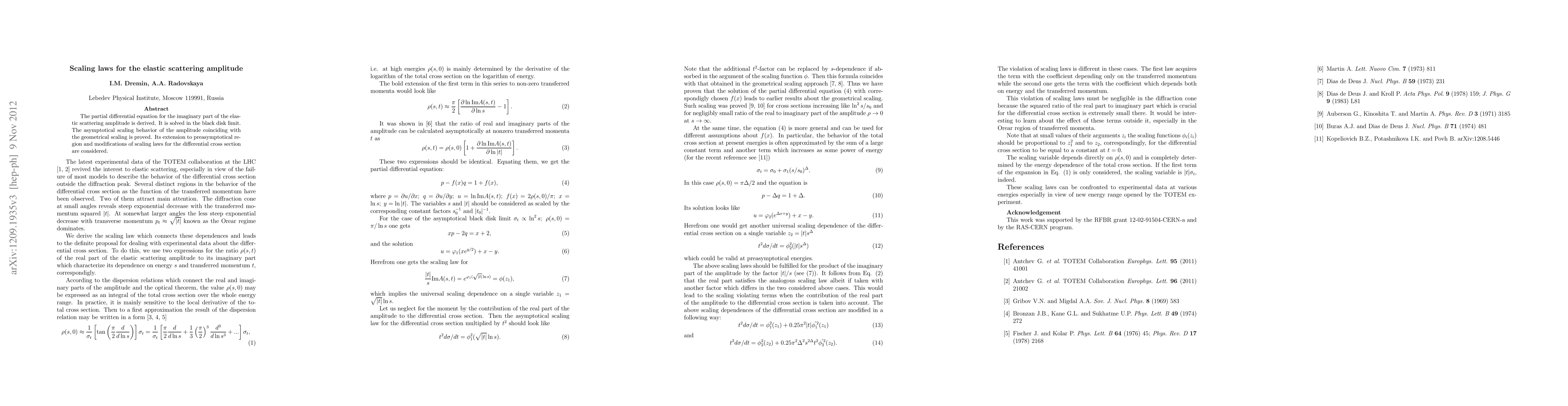 This paper derives a partial differential equation for the elastic scattering amplitude's imaginary part and solves it in the black disk limit, proving the asymptotic scaling behavior that aligns with geometrical scaling. It also explores the extension to the preasymptotic region and modifies scaling laws for the differential cross section.