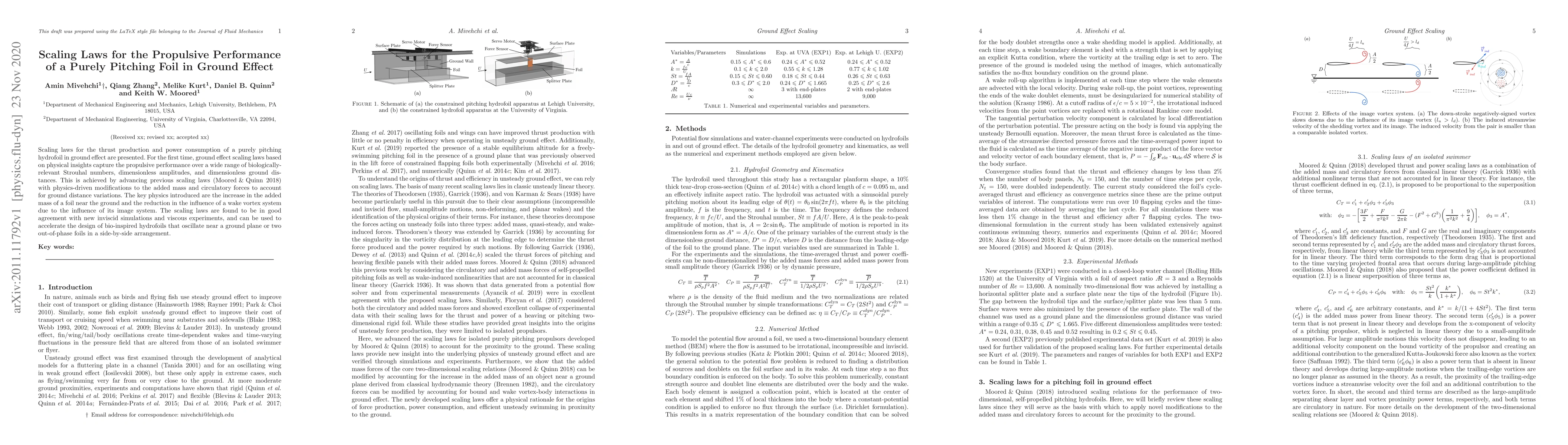 This paper presents new scaling laws for the thrust and power of a pitching hydrofoil in ground effect, capturing performance across various Strouhal numbers and ground distances. The laws incorporate physics-driven modifications for added mass and circulatory forces, validated by simulations and experiments, and aim to enhance bio-inspired hydrofoil design.