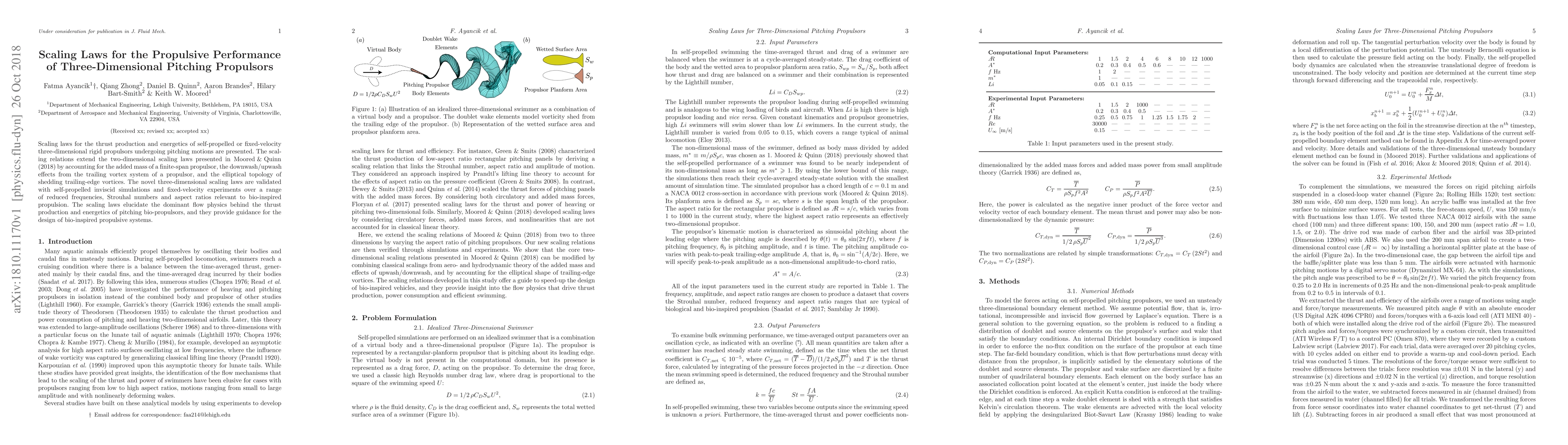 This paper presents novel three-dimensional scaling laws for the thrust and energetics of pitching propulsors, extending previous two-dimensional models. The new laws incorporate added mass, vortex effects, and elliptical vortex shedding, validated through simulations and experiments, offering insights into bio-inspired propulsion design.