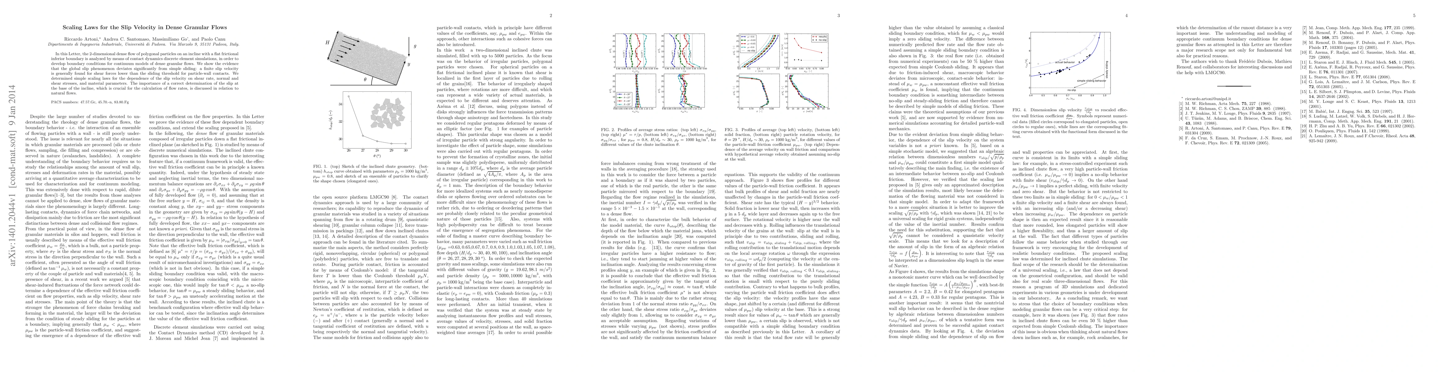This paper investigates the slip velocity in 2-dimensional dense granular flows on an incline using discrete element simulations. It reveals that slip velocity deviates from simple sliding and establishes scaling laws for its dependence on shear rate, stresses, and material parameters, emphasizing the importance of accurate slip determination for flow rate calculations.