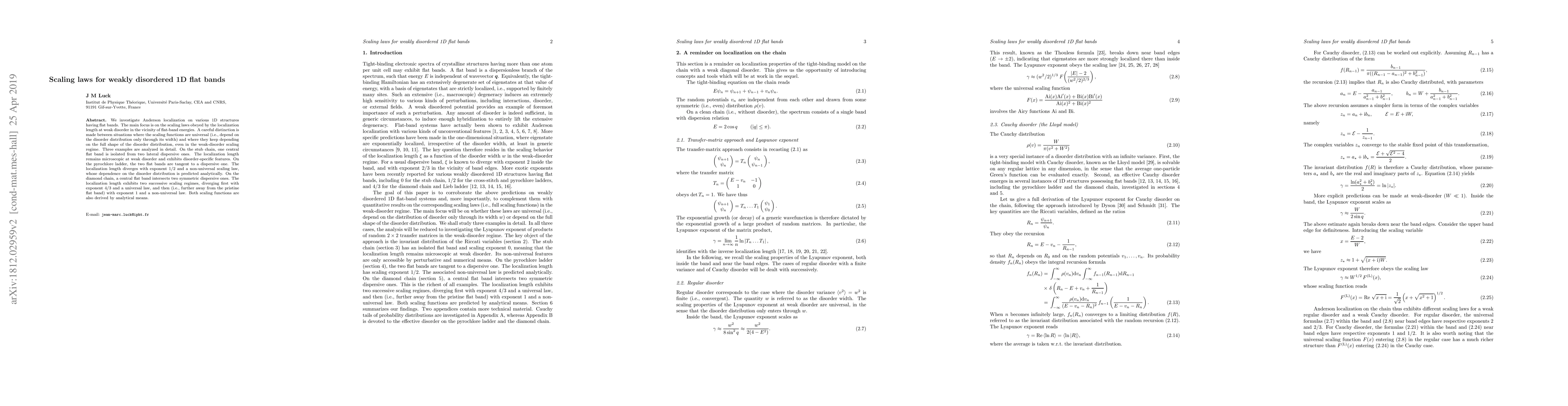 The paper presents a comprehensive study of scaling laws for weakly disordered 1D flat bands, reducing the analysis of localization lengths to the Lyapunov exponents of products of random 2x2 transfer matrices.