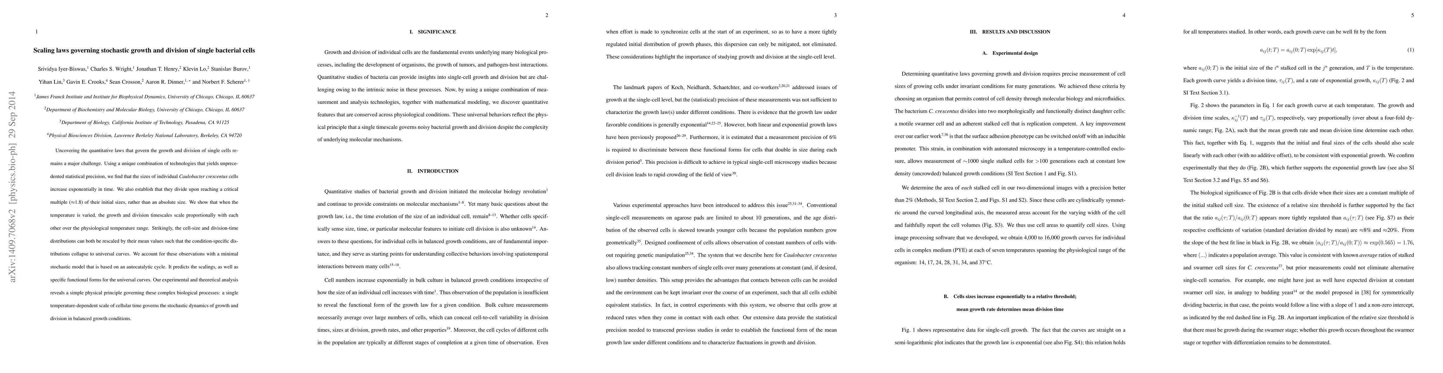 This paper reveals that Caulobacter crescentus cells grow exponentially and divide when they reach a size multiple of their initial size, approximately 1.8 times. The study finds a proportional scaling between growth and division timescales with temperature variation, and demonstrates that cell-size and division-time distributions collapse to universal curves when rescaled by their mean values.