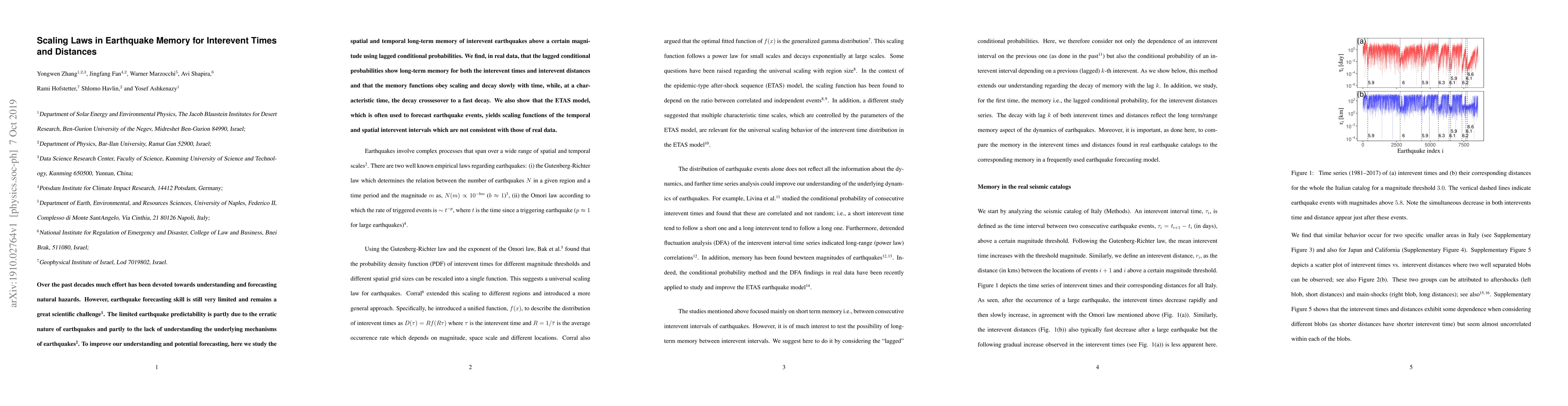 This paper investigates the long-term memory in earthquake interevent times and distances using lagged conditional probabilities, revealing a slow decay that transitions to a fast decay at a characteristic time. The study finds that the ETAS model does not match the observed scaling functions of real data.