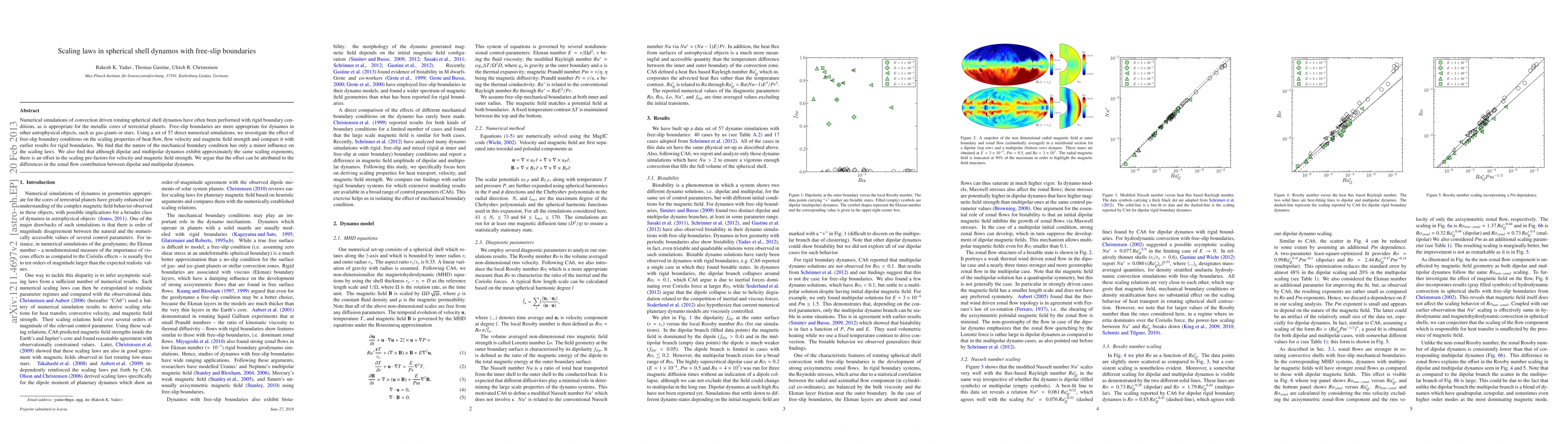 This paper investigates the impact of free-slip versus rigid boundary conditions on the scaling laws in spherical shell dynamos through 57 numerical simulations. It finds minor differences in scaling laws due to boundary conditions, but notes an offset in pre-factors for velocity and magnetic field strength between dipolar and multipolar dynamos, likely due to zonal flow differences.