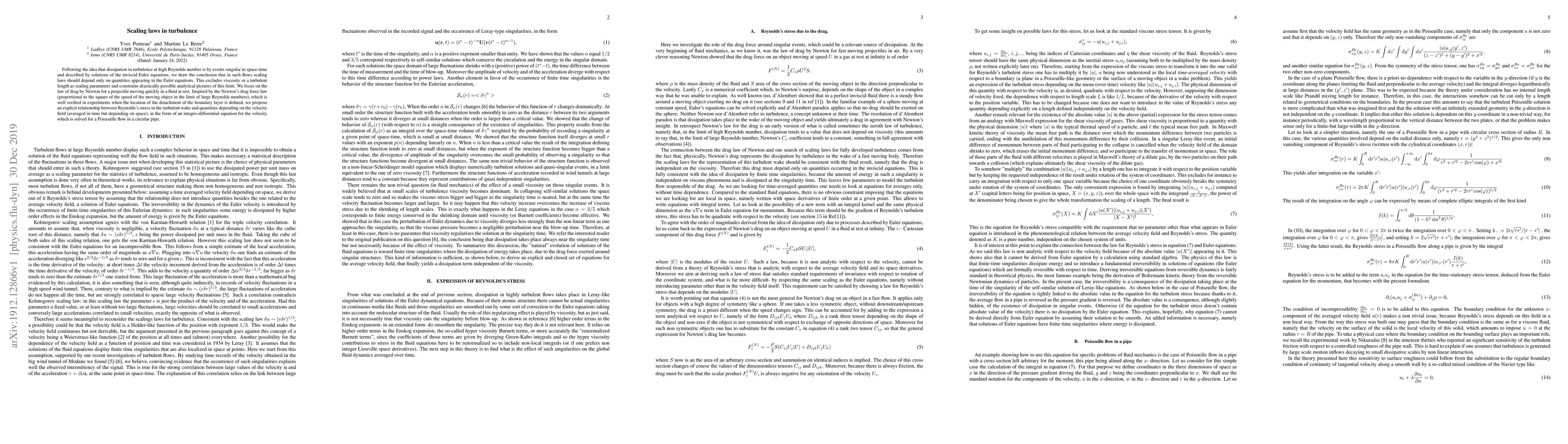 This paper explores scaling laws in high Reynolds number turbulence, arguing that dissipation is driven by singular events described by inviscid Euler equations, excluding viscosity as a scaling parameter. It proposes an explicit relationship between Reynolds's stress and velocity field quantities, formulating an integro-differential equation for velocity, which is solved for Poiseuille flow in a circular pipe.