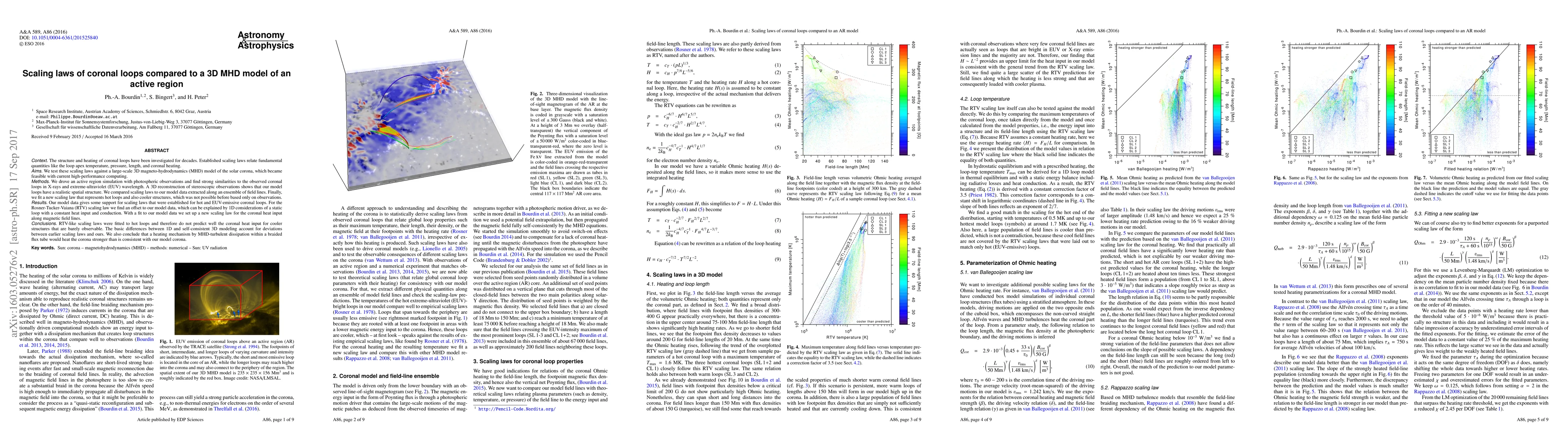 Context. The structure and heating of coronal loops are investigated since decades. Established scaling laws relate fundamental quantities like the loop apex temperature, pressure, length, and the coronal heating. Aims. We test such scaling laws against a large-scale 3D MHD model of the Solar corona, which became feasible with nowadays high-performance computing. Methods. We drive an active region simulation a with photospheric observations and found strong similarities to the observed coronal loops in X-rays and EUV wavelength. A 3D reconstruction of stereoscopic observations showed that our model loops have a realistic spatial structure. We compare scaling laws to our model data extracted along an ensemble of field lines. Finally, we fit a new scaling law that represents well hot loops and also cooler structures, which was not possible before only based on observations. Results. Our model data gives some support for scaling laws that were established for hot and EUV-emissive coronal loops. For the RTV scaling law we find an offset to our model data, which can be explained by 1D considerations of a static loop with a constant heat input and conduction. With a fit to our model data we set up a new scaling law for the coronal heat input along magnetic field lines. Conclusions. RTV-like scaling laws were fitted to hot loops and therefore do not predict well the coronal heat input for cooler structures that are hardly observable. The basic differences between 1D and self-consistent 3D modeling account for deviations between our and earlier scaling laws. We also conclude that a heating mechanism by MHD-turbulent dissipation within a braided flux tube would heat the corona stronger than consistent with our model corona.