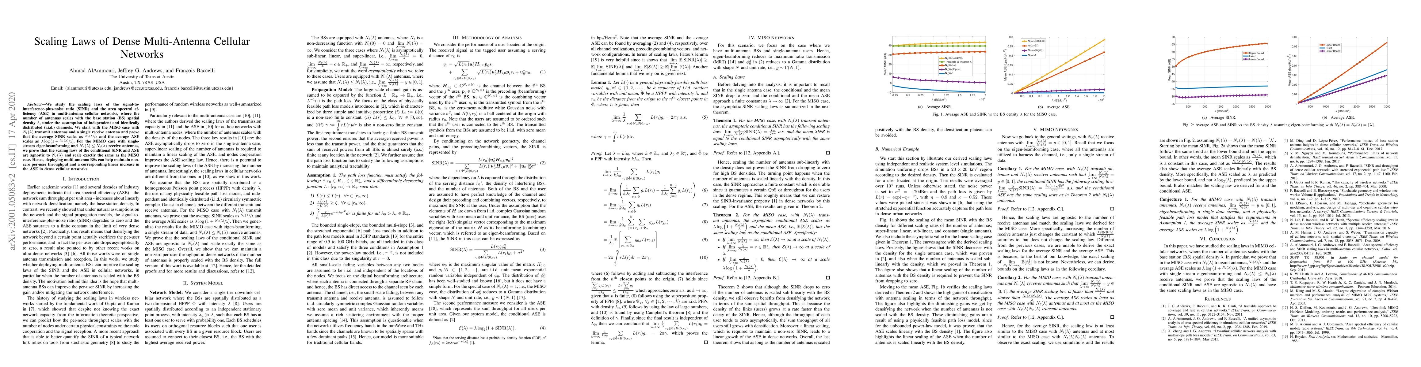 This research investigates scaling laws for signal-to-interference-plus-noise ratio (SINR) and area spectral efficiency (ASE) in multi-antenna cellular networks, showing that average SINR scales as $\frac{N_t(\lambda)}{\lambda}$ and ASE as $\lambda\log\left(1+\frac{N_t(\lambda)}{\lambda}\right)$. It finds that MIMO systems with eigenbeamforming maintain these scaling laws regardless of the number of receive antennas.