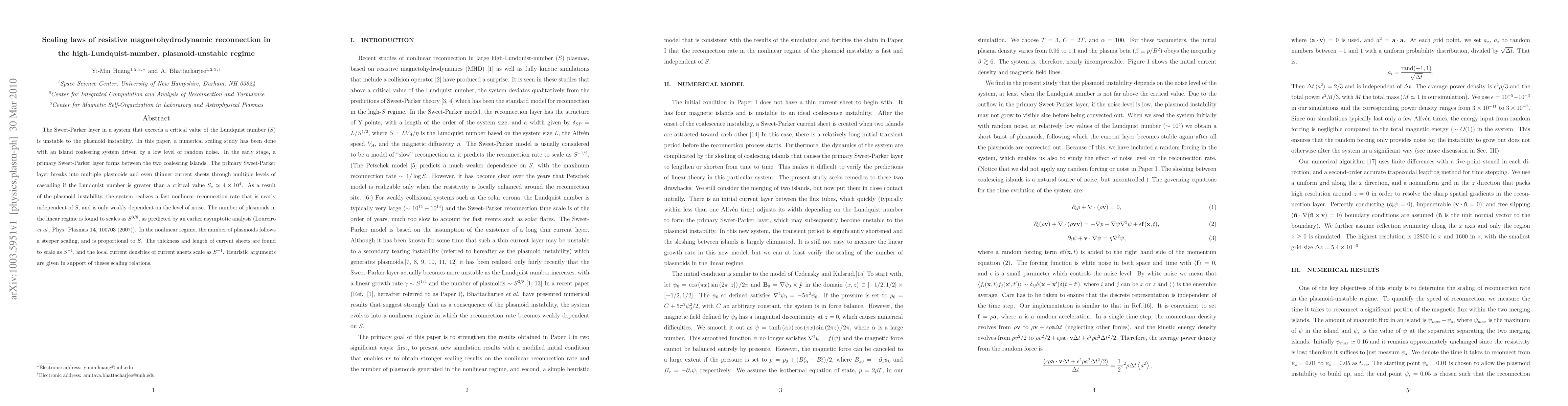 This paper investigates the scaling laws of resistive magnetohydrodynamic reconnection in systems with high Lundquist numbers, where the Sweet-Parker layer becomes unstable to plasmoid formation. The study finds that above a critical Lundquist number, the system exhibits fast reconnection rates nearly independent of $S$, with a scaling of plasmoid number as $S^{3/8}$ in the linear regime and $S$ in the nonlinear regime.