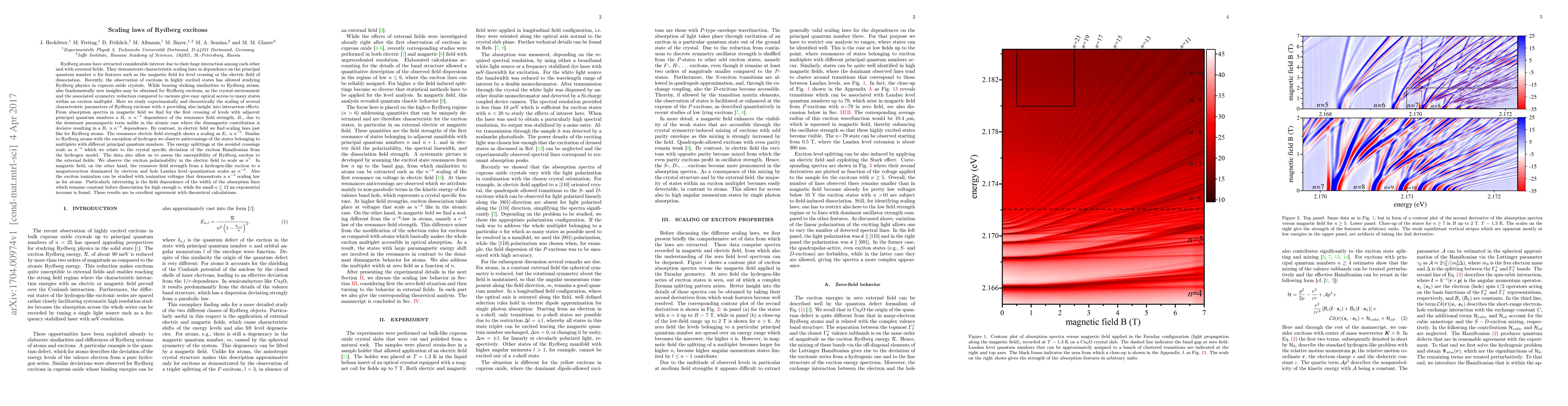 Rydberg atoms have attracted considerable interest due to their huge interaction among each other and with external fields. They demonstrate characteristic scaling laws in dependence on the principal quantum number $n$ for features such as the magnetic field for level crossing. While bearing striking similarities to Rydberg atoms, fundamentally new insights may be obtained for Rydberg excitons, as the crystal environment gives easy optical access to many states within an exciton multiplet. Here we study experimentally and theoretically the scaling of several characteristic parameters of Rydberg excitons with $n$. From absorption spectra in magnetic field we find for the first crossing of levels with adjacent principal quantum numbers a $B_r \propto n^{-4}$ dependence of the resonance field strength, $B_r$, due to the dominant paramagnetic term unlike in the atomic case where the diamagnetic contribution is decisive. By contrast, in electric field we find scaling laws just like for Rydberg atoms. The resonance electric field strength scales as $E_r \propto n^{-5}$. We observe anticrossings of the states belonging to multiplets with different principal quantum numbers. The energy splittings at the avoided crossings scale as $n^{-4}$ which we relate to the crystal specific deviation of the exciton Hamiltonian from the hydrogen model. We observe the exciton polarizability in the electric field to scale as $n^7$. In magnetic field the crossover field strength from a hydrogen-like exciton to a magnetoexciton dominated by electron and hole Landau level quantization scales as $n^{-3}$. The ionization voltages demonstrate a $n^{-4}$ scaling as for atoms. The width of the absorption lines remains constant before dissociation for high enough $n$, while for small $n \lesssim 12$ an exponential increase with the field is found. These results are in excellent agreement with theoretical calculations.