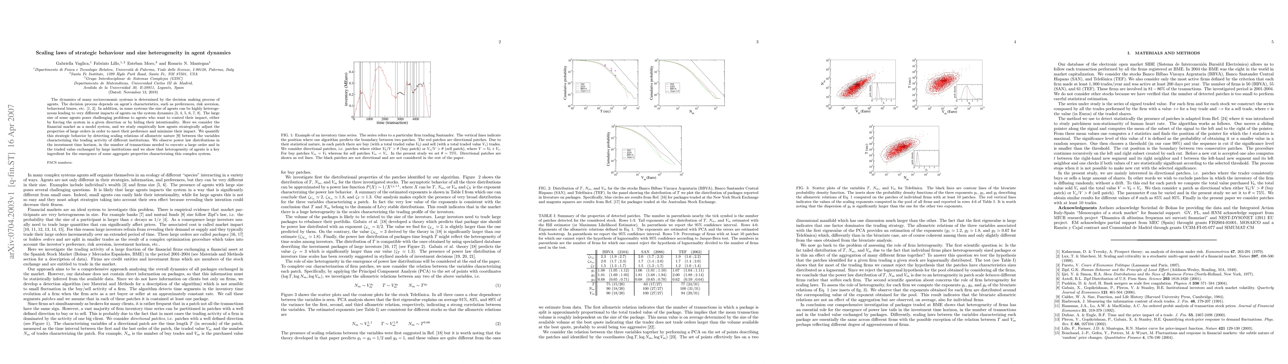 The dynamics of many socioeconomic systems is determined by the decision making process of agents. The decision process depends on agent's characteristics, such as preferences, risk aversion, behavioral biases, etc.. In addition, in some systems the size of agents can be highly heterogeneous leading to very different impacts of agents on the system dynamics. The large size of some agents poses challenging problems to agents who want to control their impact, either by forcing the system in a given direction or by hiding their intentionality. Here we consider the financial market as a model system, and we study empirically how agents strategically adjust the properties of large orders in order to meet their preference and minimize their impact. We quantify this strategic behavior by detecting scaling relations of allometric nature between the variables characterizing the trading activity of different institutions. We observe power law distributions in the investment time horizon, in the number of transactions needed to execute a large order and in the traded value exchanged by large institutions and we show that heterogeneity of agents is a key ingredient for the emergence of some aggregate properties characterizing this complex system.