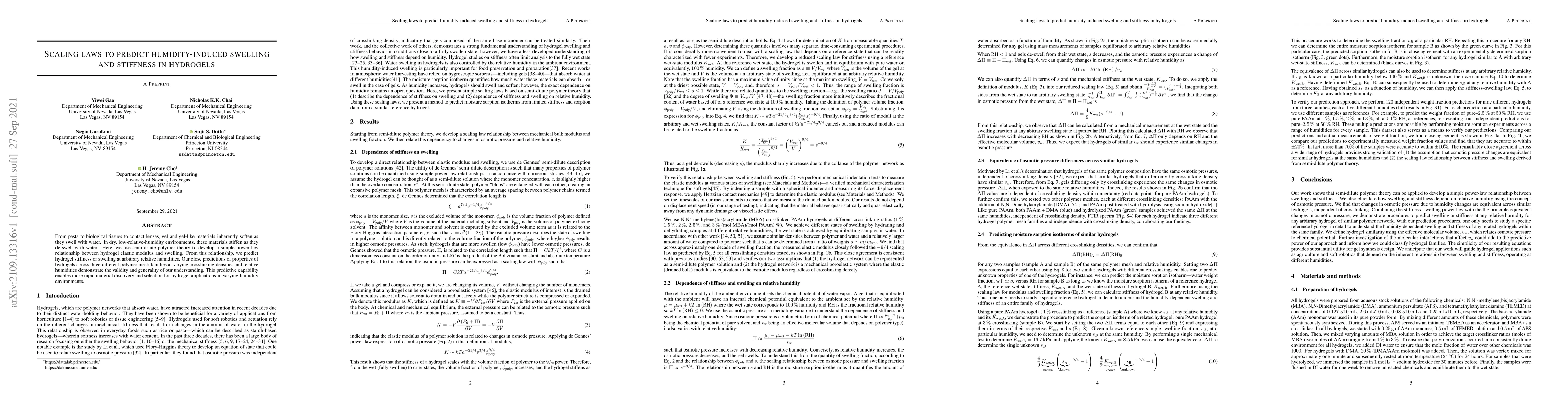 This paper develops a power-law relationship based on semi-dilute polymer theory to predict humidity-induced swelling and stiffness in hydrogels, demonstrating its validity across different polymer types and conditions. This predictive model facilitates faster material selection for hydrogel applications in diverse humidity settings.