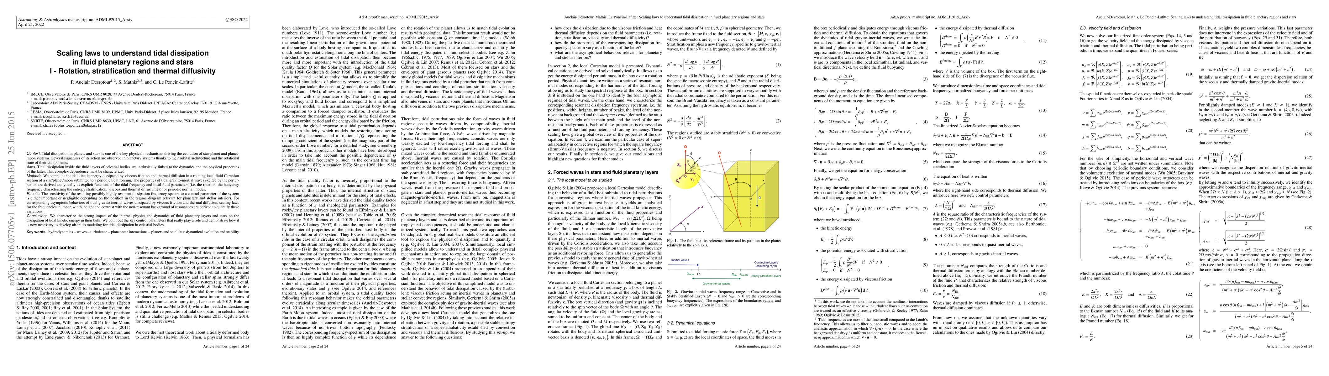 This paper investigates the tidal dissipation mechanisms in fluid layers of celestial bodies, deriving analytical expressions for tidal gravito-inertial waves and their dissipation. It highlights the importance of rotation, stratification, and thermal diffusivity in determining the dissipation frequency-spectra and proposes scaling laws to quantify these effects.